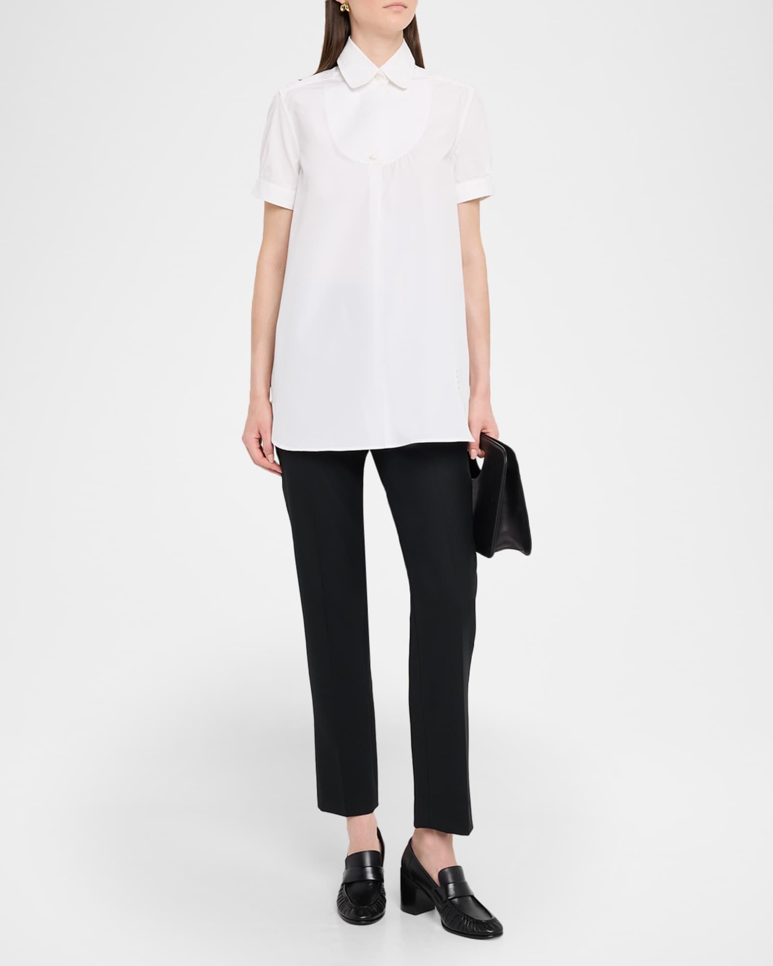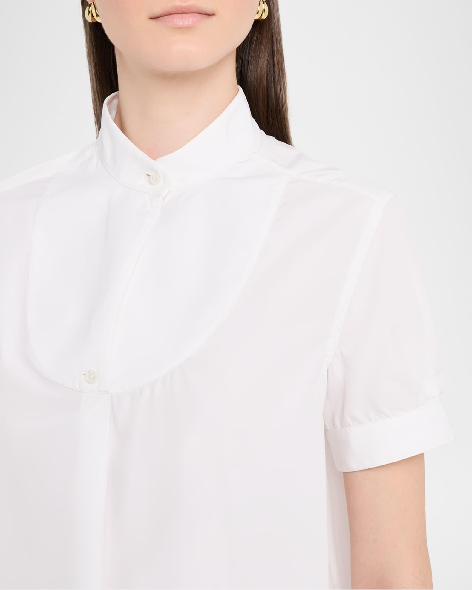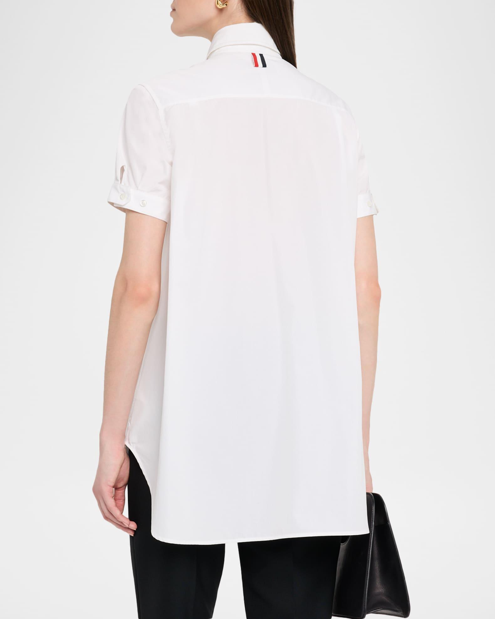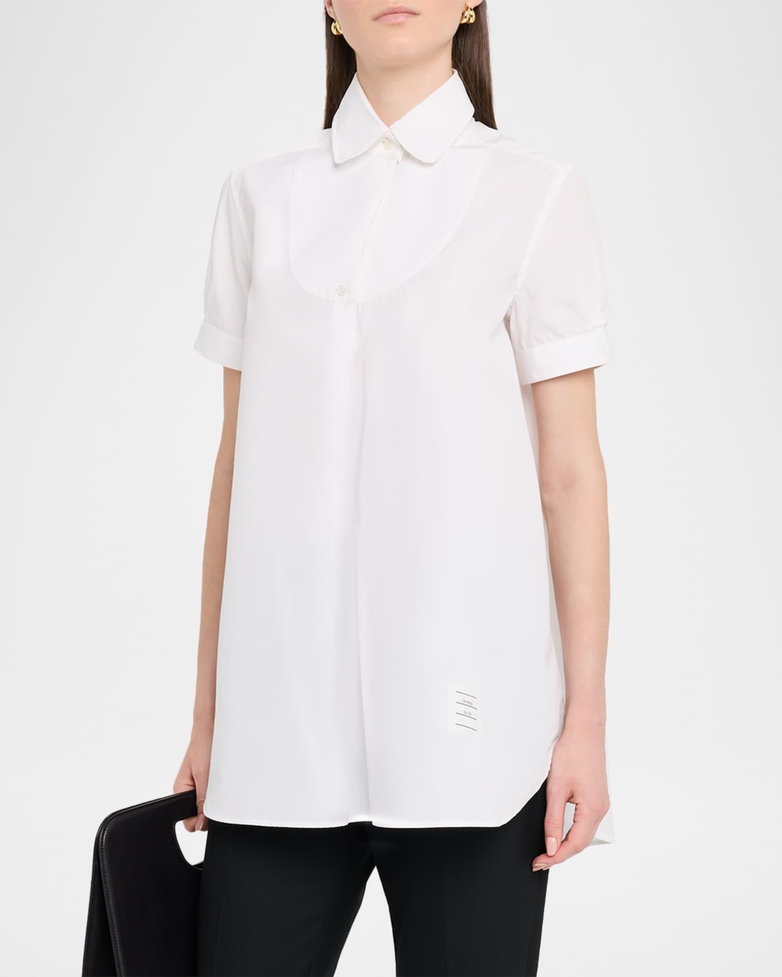 Clean lines meet tailored ease in this Thom Browne tunic-style shirt, cut from crisp cotton poplin. The front bib detail nods to classic shirting traditions, adding subtle structure to the fluid silhouette Round collar Bib design; two-button front Short sleeves Nametag applique Signature striped grosgrain loop-back tab Cotton Made in Italy