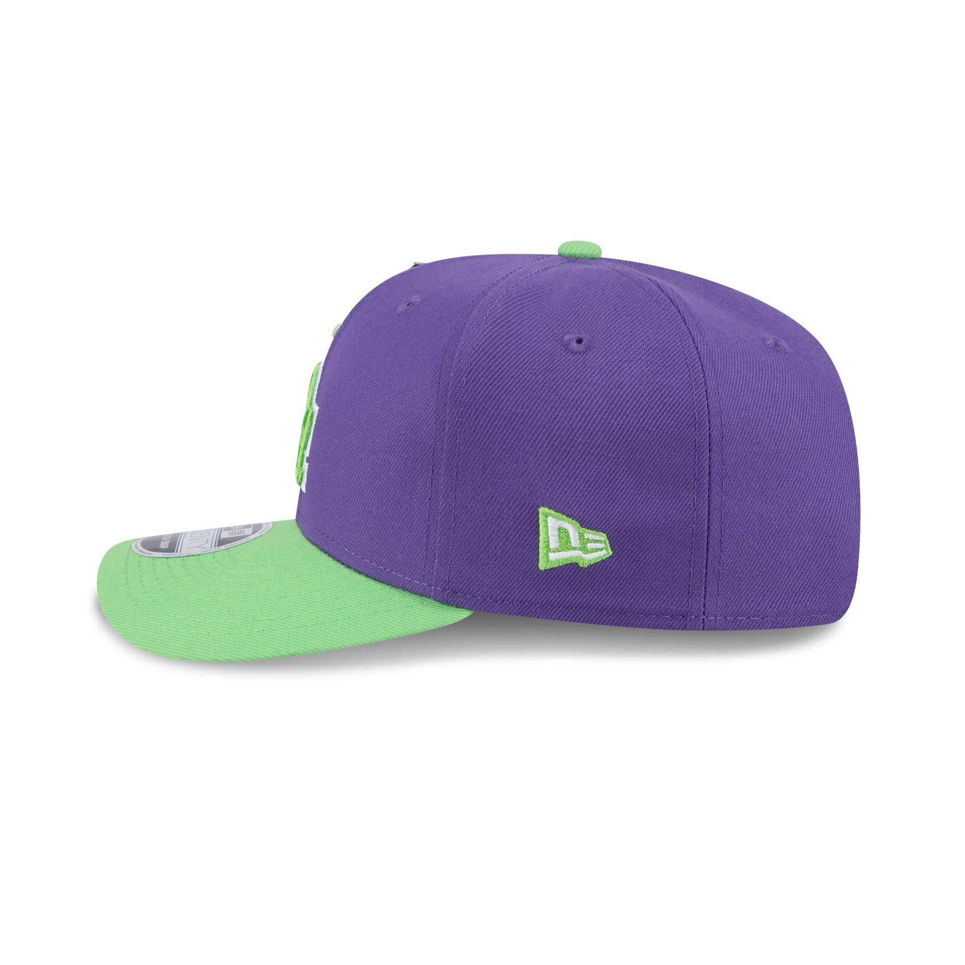 The Big League Chew X Los Angeles Dodgers Swingin' Sour Apple 9SEVENTY Stretch-Snap features an embroidered Dodgers logo and a Big League Chew Swingin' Sour Apple pin at the front panels. Additional details include a Big League Chew logo at the right-wear side, a green visor, and gray undervisor.