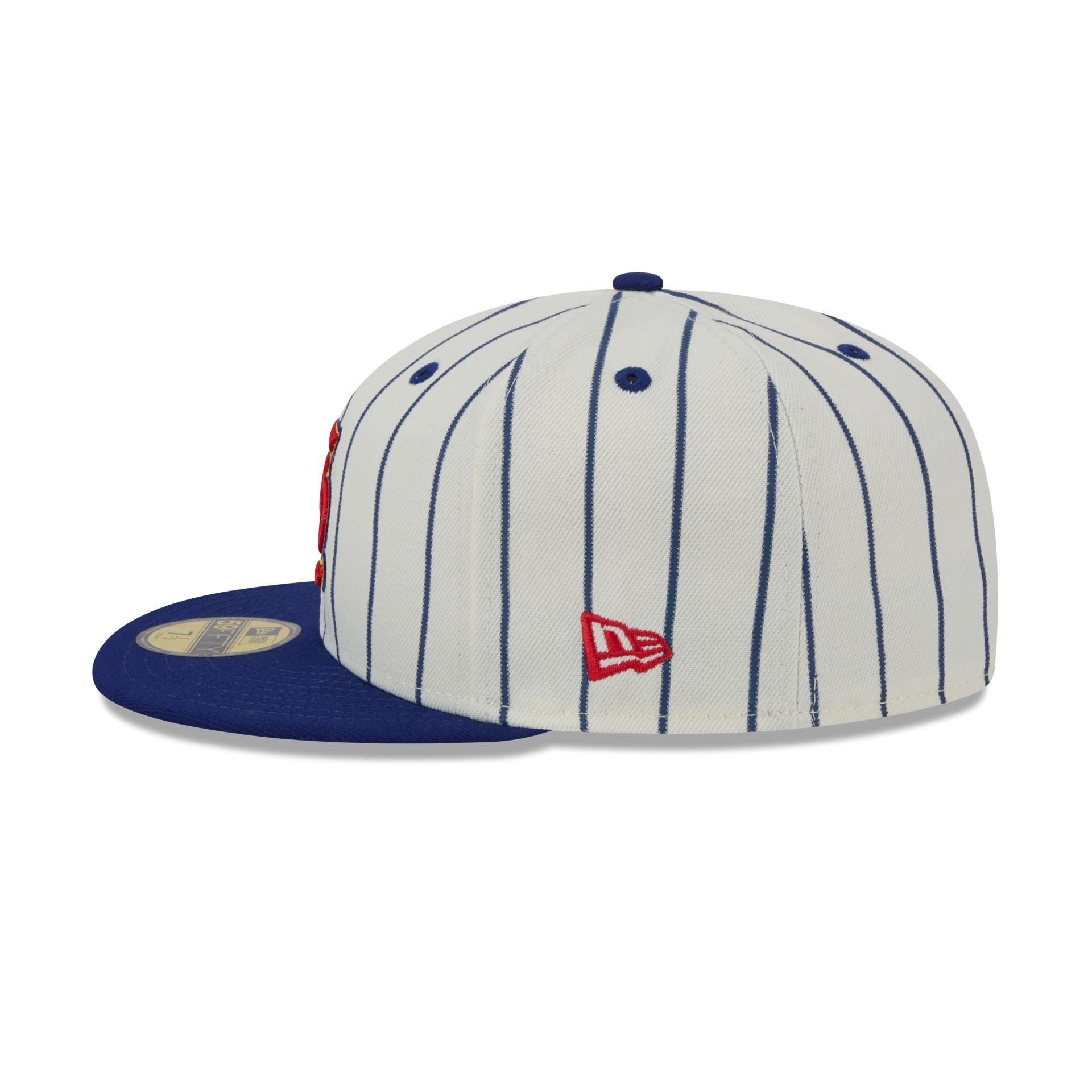 The Big League Chew X St. Louis Cardinals Pinstripe 59FIFTY Fitted Cap features an embroidered Cardinals logo and a Big League Chew Bubble Gum pin at the front panels with a matching MLB Batterman logo at the rear. Additional details include a Big League Chew wordmark at the right-wear side, a blue visor, and a gray undervisor.