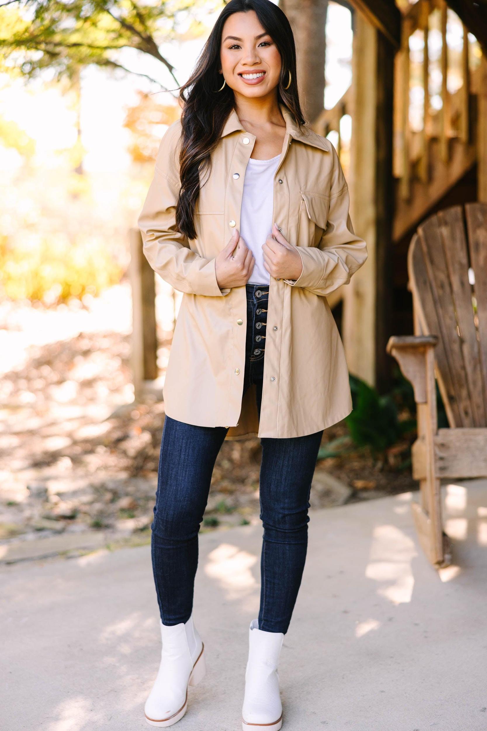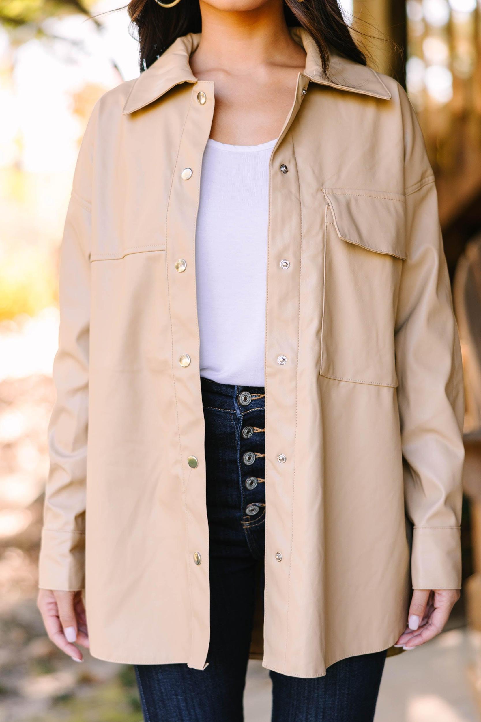 We hope you have some big plans for this shacket! It's so edgy and sassy! That faux leather fabric is super chic and we love the color! This shacket is going to take any outfit to the next level! This shacket features long sleeves, a collared neckline, a button down front closure, and a faux leather fabric. Material has no amount of stretch.Cindy is wearing the small.