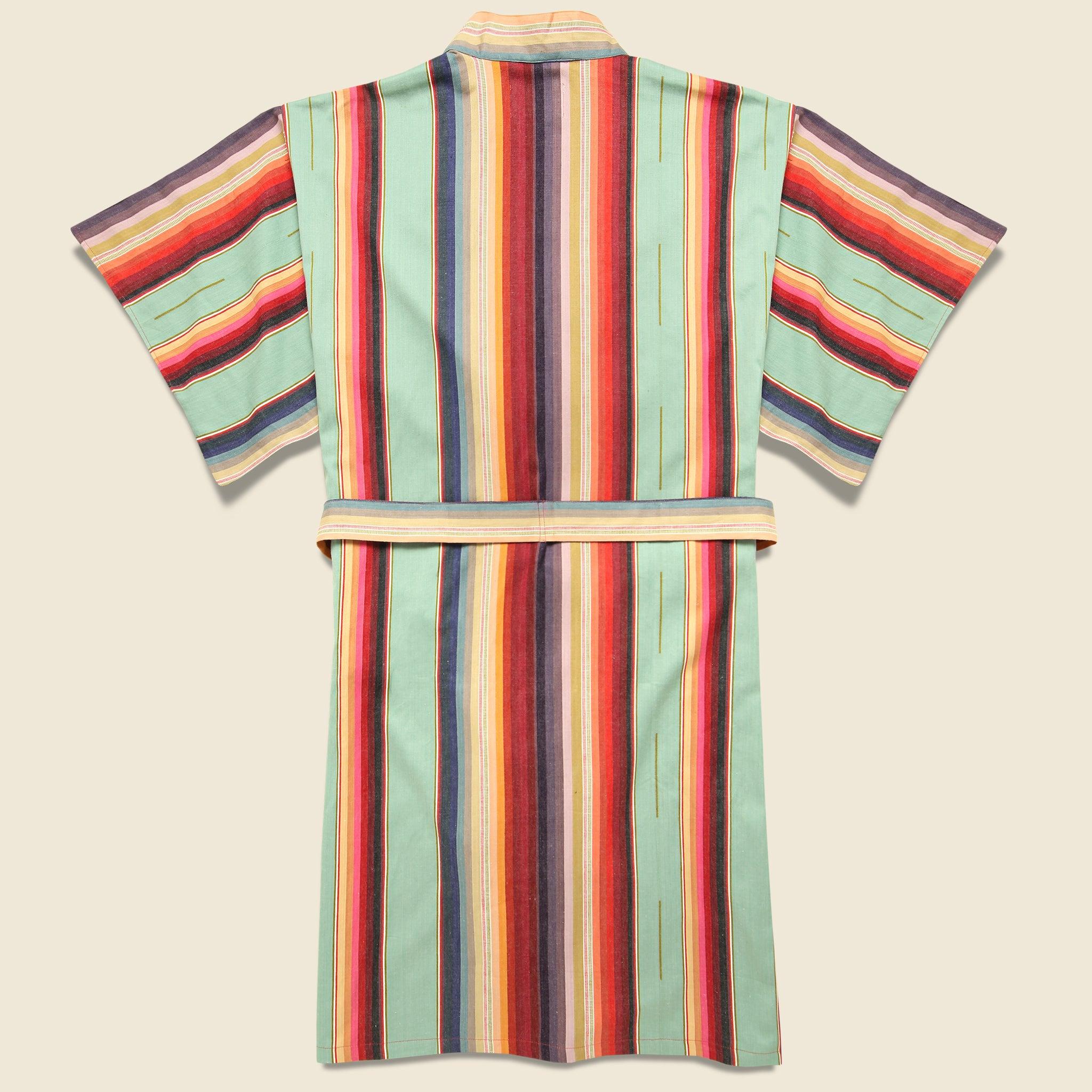 El Cosmico’s signature kimono style robe is made in small batches by hand from a super soft, 100% cotton that's woven with their favorite turquoise and red blanket stripe pattern. It’s got a comfortable oversized fit that’s detailed with two waist pockets and an attached waist tie. Made in a co-op in India devoted to promoting and preserving indigenous weaving and dyeing techniques, each piece may have some slight variations due to the handmade process. Handmade kimono-style robe Turquoise and red blanket stripe Attached waist tie Two welt pockets at the waist Roomy, comfortable fit One Size Materials: 100% cotton Measurements: Chest: 50” | Sleeve: 24 ½” | Shoulder: 26” | Length: 48”