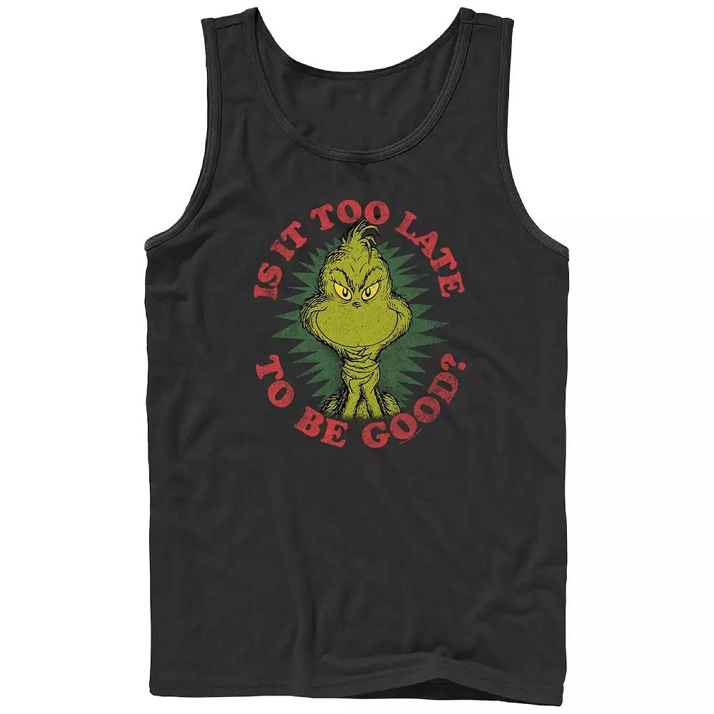 Youll love the fit and feel of this Big & Tall Dr. Seuss Grinch Is It Too Late To Be Good? Tank Youll love the fit and feel of this Big & Tall Dr. Seuss Grinch Is It Too Late To Be Good? Tank FEATURES Crewneck SleevelessFABRIC & CARE Cotton Machine wash Imported Color: Black. Gender: male. Age Group: adult.