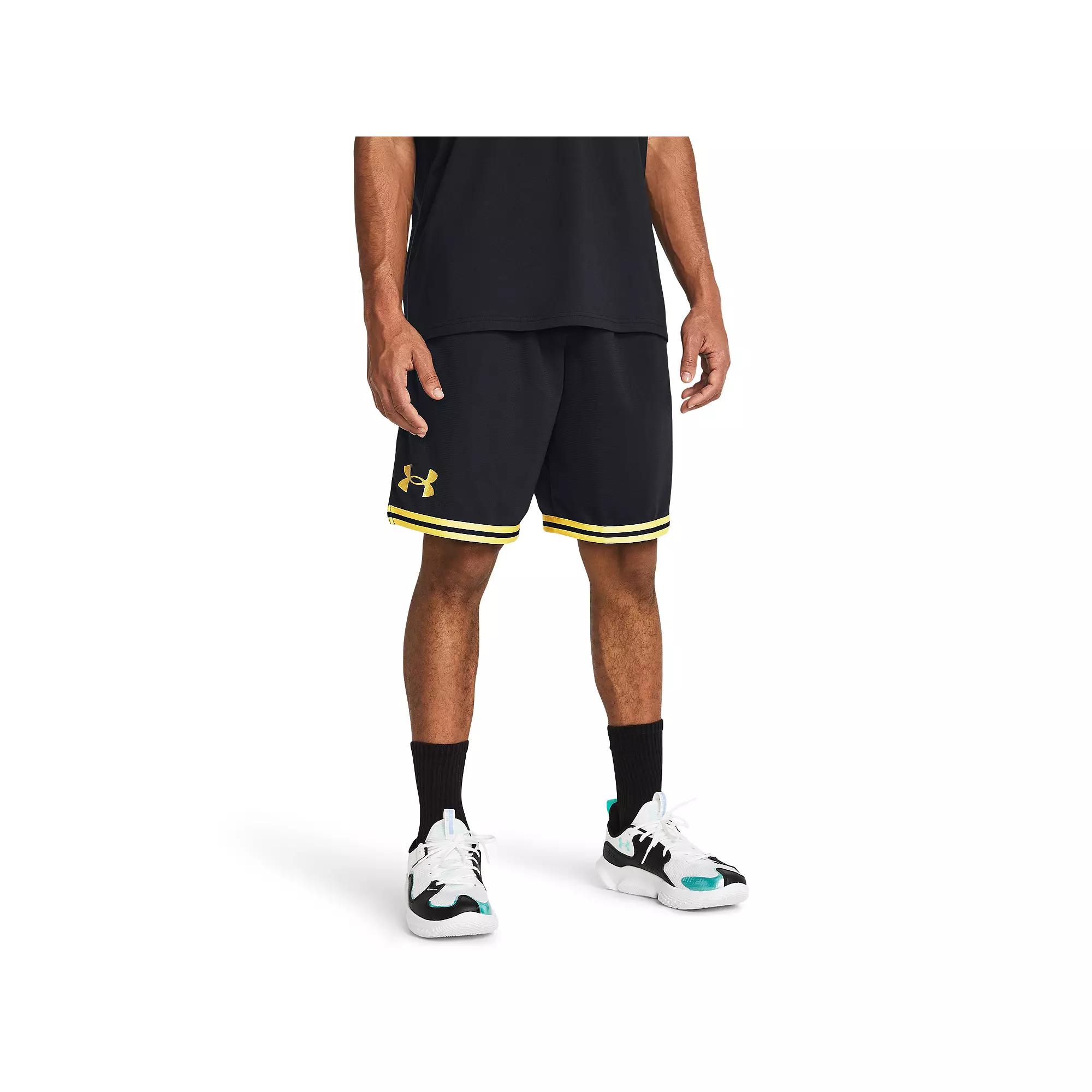 Whether he's running errands or working out he'll love the look of these men's Under Armour zone shorts. Click on this MEN'S GUIDE to find the perfect fit and more! TECHNOLOGIES & FEATURES Textured knit construction Moisture-wicking technology Breathable 2 side pocketsFIT & SIZING 12 in. inseam Midrise sits above the hip Loose fit Drawstring elastic waistbandFABRIC & CARE Polyester Machine wash Imported Size: XL Tall. Color: Black Metallic Gold. Gender: male. Age Group: adult.