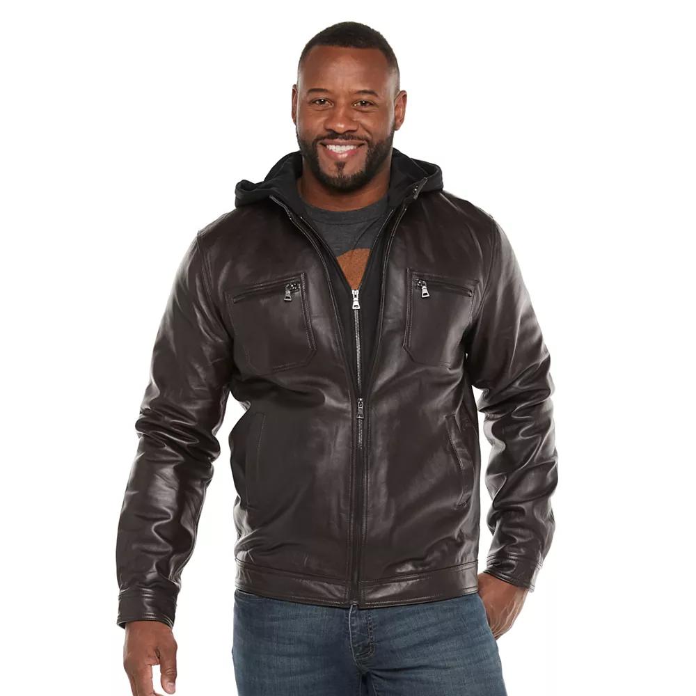 Rugged style. Stand out in a crowd with the handsome look of this mens leather racer jacket from Vintage Leather. Midweight insulation for comfort in colder conditions Detachable liner & hood Snap collar Zip front 5-pocket Long sleeves FIT & SIZING Classic fit features relaxed arm holes, regular body and traditional sleeve openings Adjustable snap cuffs FABRIC & CARE Shell: leather Lining: nylon Liner: polyester Professional leather clean Imported Size: XL Tall. Color: Brown. Gender: male. Age Group: adult.