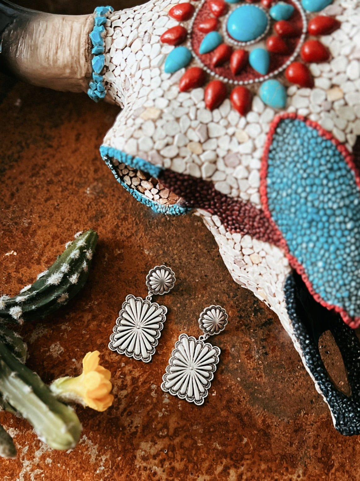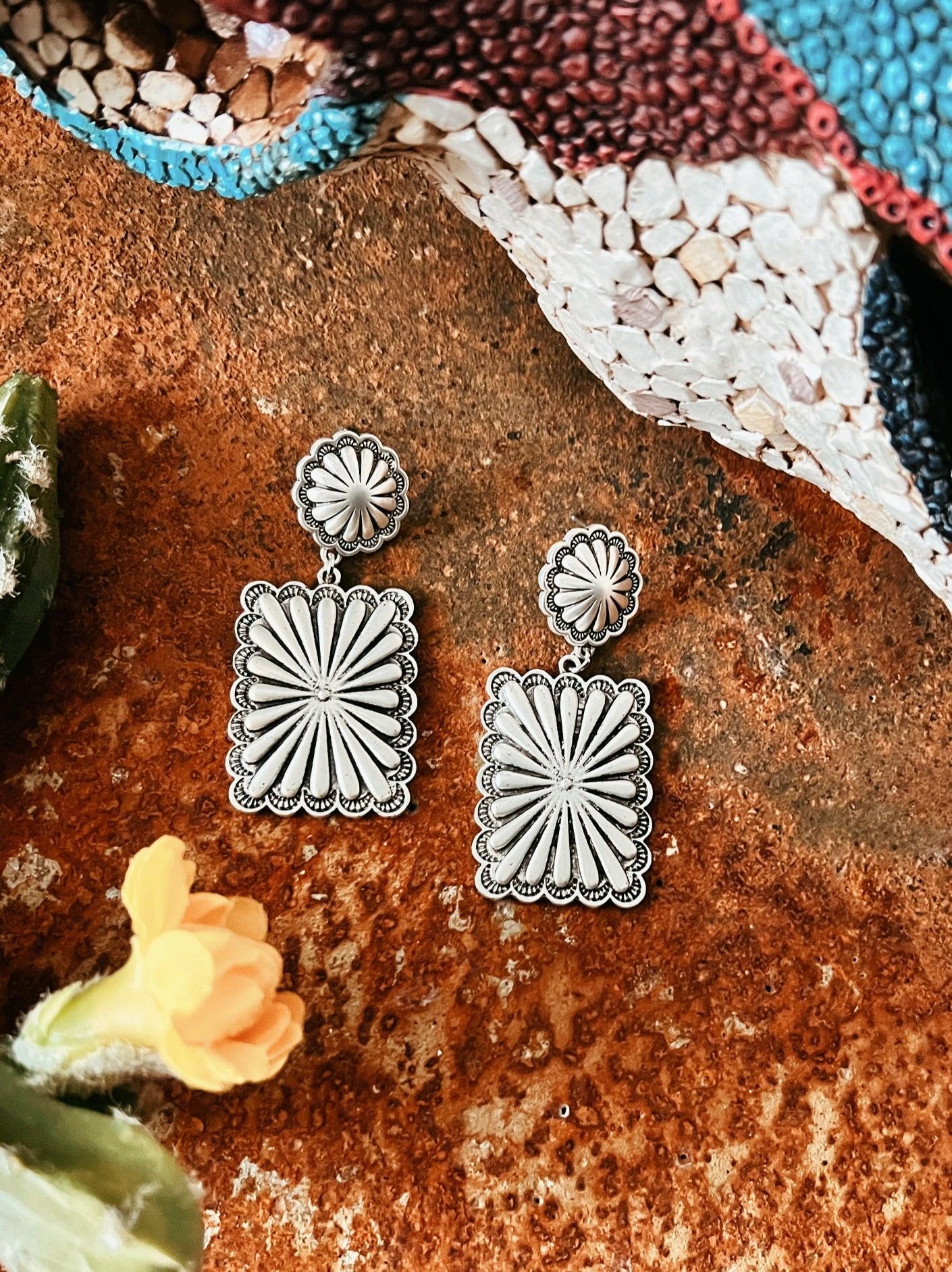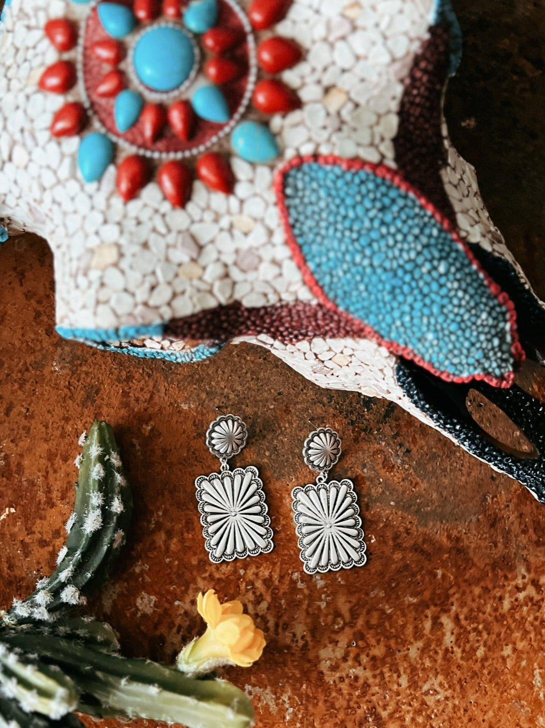 Big Western Style Post Concho Earrings | Gussied Up Online Boutique Indulge in western luxury with our Big Western Style Post Concho Earrings. Made of high-quality nickel, lead, and chrome-free alloy, these antique silver plated earrings not only make a stylish statement at 2.5" in length but also provide a hypoallergenic option for sensitive ears. Elevate your style with these exclusive adornments.