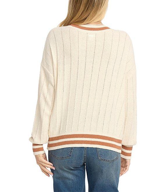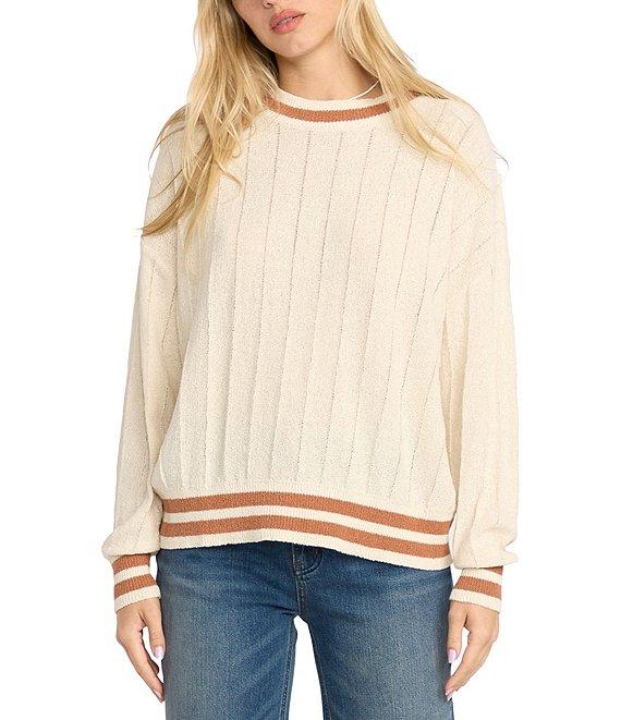 From Billabong, this sweater features: Open stitch weave Round neckline Long sleeves Pullover styling Striped neckline, cuffs and hem Signature metal plate Relaxed fit Breathable cotton/acrylic/nylon loose-knit jersey Hand wash/line dry Imported.