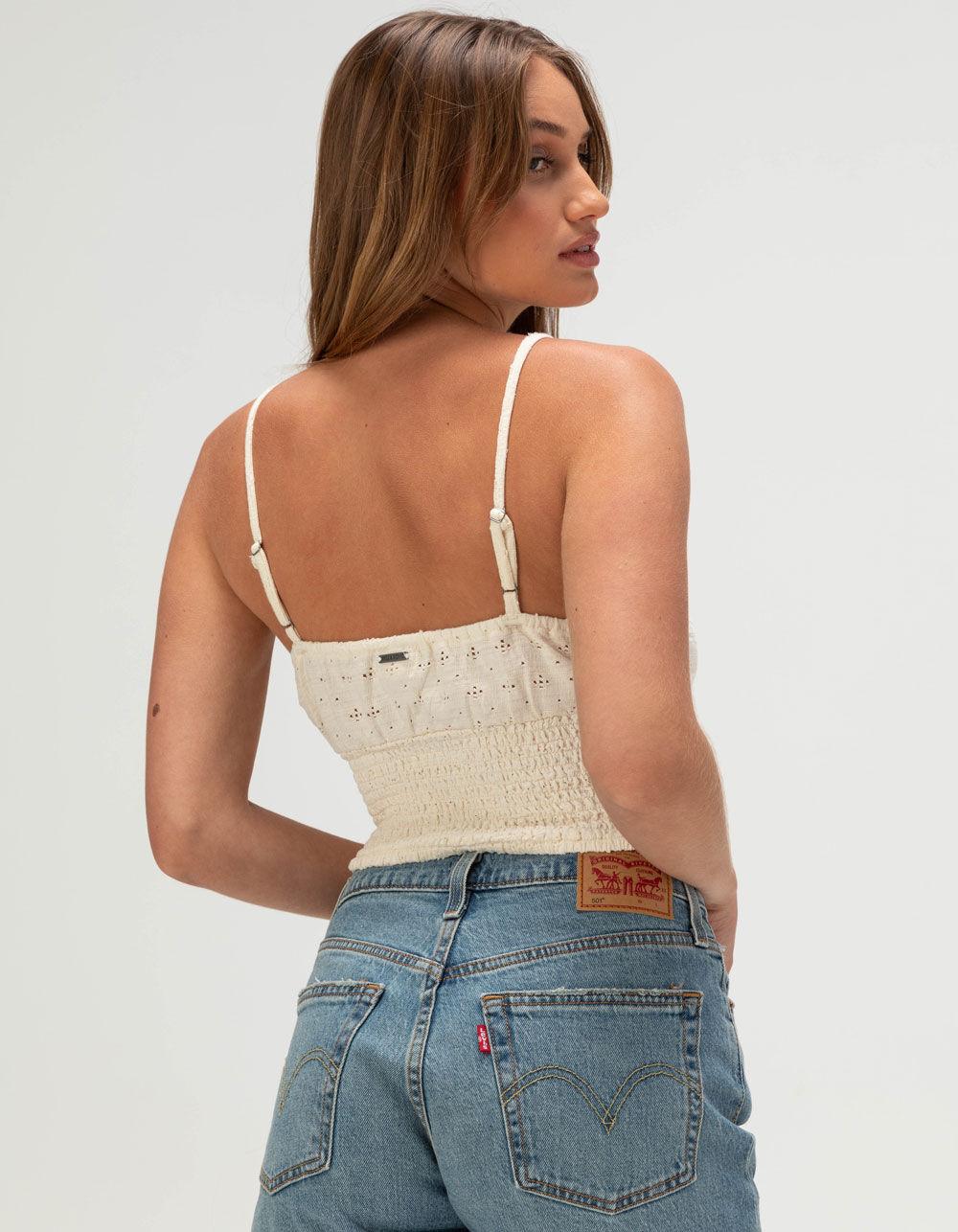 Billabong Summer Babe Smocked Top. Capture effortless summer vibes with the Billabong Summer Babe Smocked Top. This cropped, smocked top features a flattering V-neckline with a charming tie detail, adding a touch of softness to its playful silhouette. Delicate pointelle accents and lined cups offer both texture and light support, while the sleeveless design with adjustable shoulder straps ensures a customizable, comfortable fit. Finished with signature metal badge branding, this top is perfect for pairing with high-rise denim or flowy skirts for a breezy, sun-soaked look. 78% Cotton 22% Polyester. Lining: 100% Cotton. Machine wash. Imported.