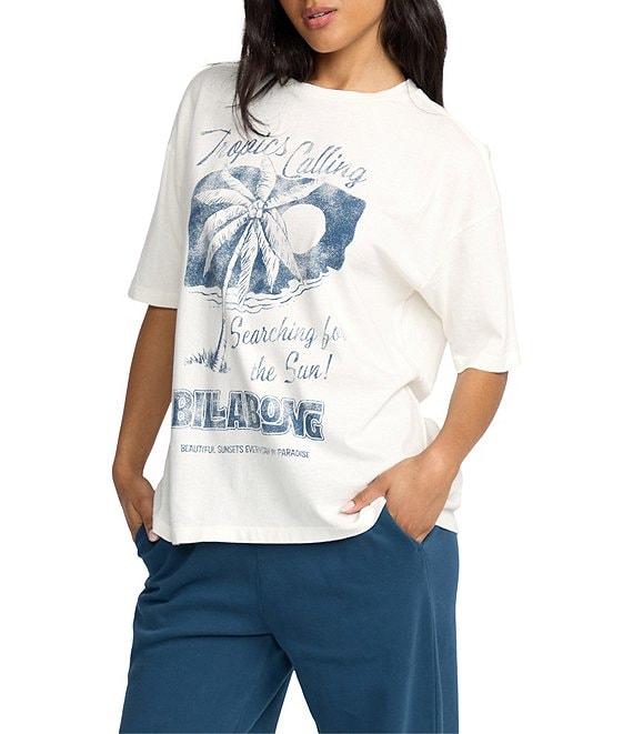 From Billabong, this t-shirt features: Round neckline Short sleeves Scenic graphic with palm tree, "Billabong" logo and other verbiage screen printed on the front Pullover styling Pigment-dyed cotton loose-knit jersey Machine wash/tumble dry Imported.