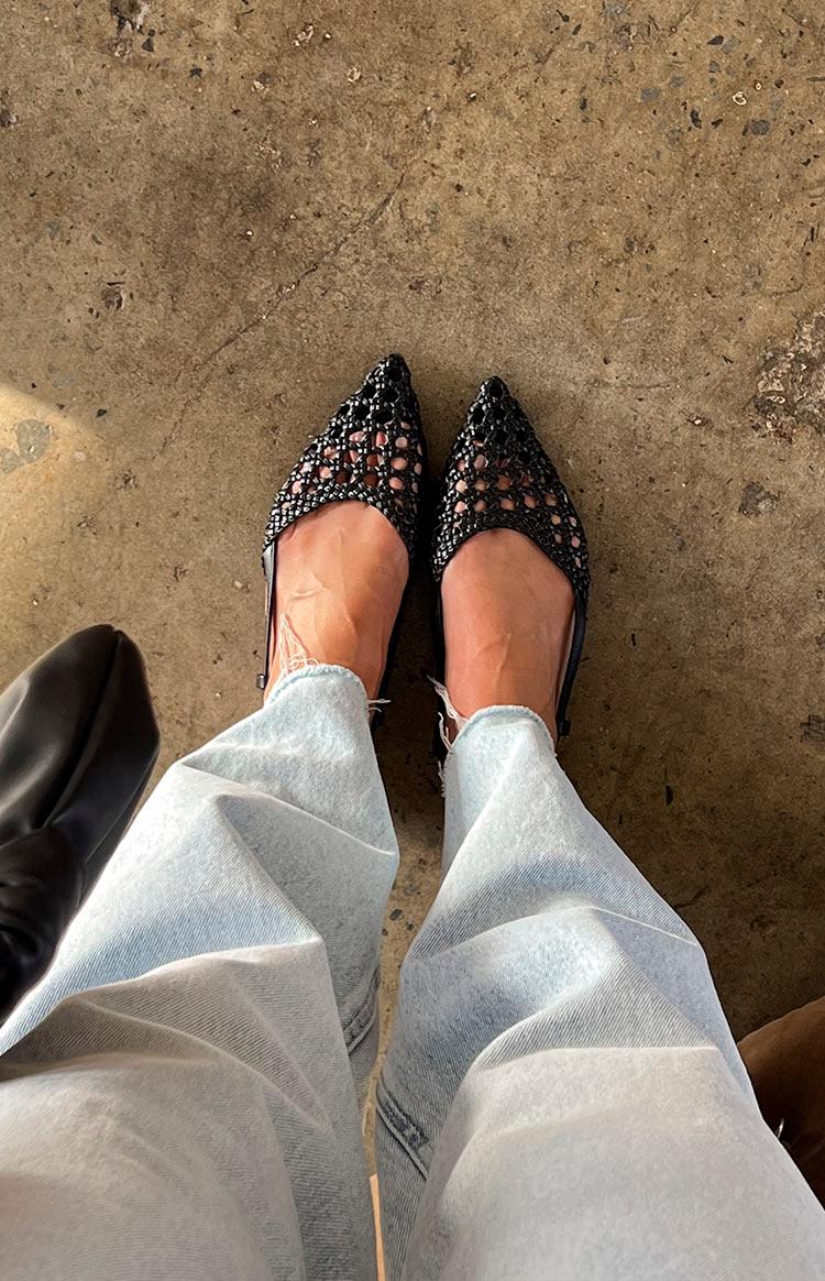 Alexandra Black Mules by BilliniHow to style:The Alexandra Black Mules by Billini are the ultimate summer flat! Featuring a woven upper and comfortable flat design, these mules exude luxe resort vibes. Pair with a linen mini dress to complete your summer look!Features: Flat rubber sole Closed pointed toe Slingback strap with adjustable buckle detailing Luxe woven texture Exposed heel counter