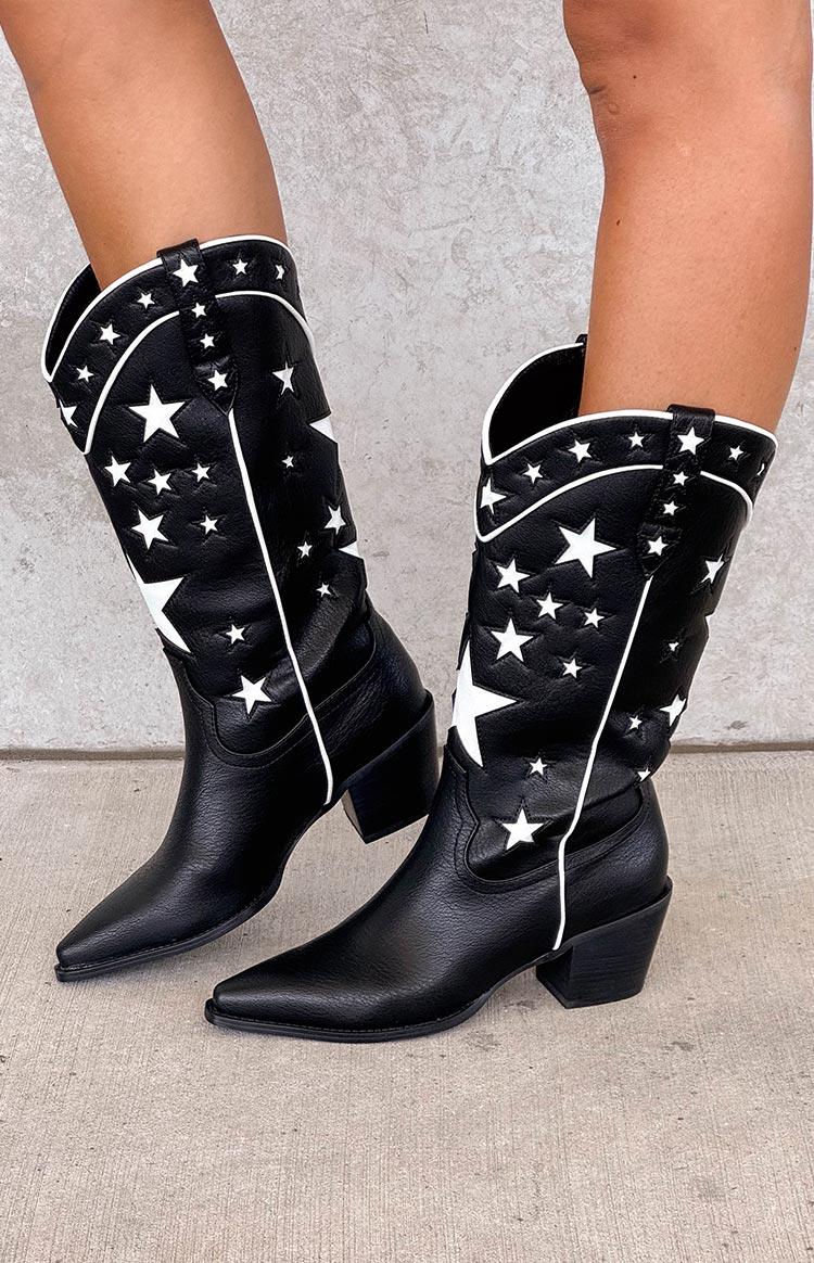 Dollie Black And White Cowboy Boots by BilliniHow to Style:The Dollie Black and White Cowboy Boots by Billini bring a perfect fusion of western charm and contemporary style. With bold black and white detailing and intricate embroidery, these boots add a statement-making touch to any outfit. Pair them with a mini dress and statement accessories for an unforgettable festival or party look.Features: Mid stacked block heel PU outer Closed pointed toe Contrast white details Easy slip on design with side pull tabs