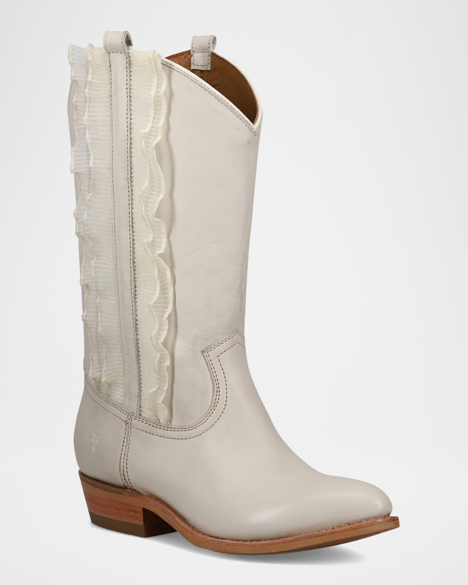 Frye "Billy" calf leather cowboy boots crafted with a chunky block heel and a sleek pointed toe, these mid-calf boots blend unique feminine details with classic western styling. The Goodyear welt construction ensures long-lasting durability, while the organza ruffles make a statement with any outfit. Pair with a skirt or fitted jeans for a chic weekend look. 1.50 in / 40 mm block heel; 0.25 in / 10 mm platform Boot shaft, approx. 11.5"H Pointed toe Pull tabs at collar Pull-on style Leather/Rubber outsole Lining: Leather Spot clean Imported