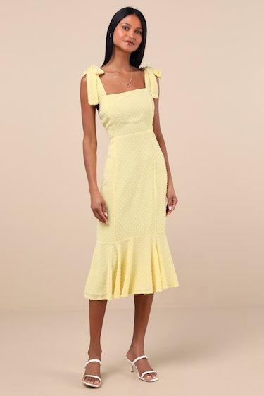 Dance along the white sand beaches in the Lulus Bimini Light Yellow Swiss Dot Tie-Strap Midi Dress! Lightweight woven poly, with fun Swiss dots, shapes tying tank straps, and a square neckline. Seamed bodice and fitted waist above a figure-skimming midi skirt with trumpet hem. Hidden back zipper/clasp.