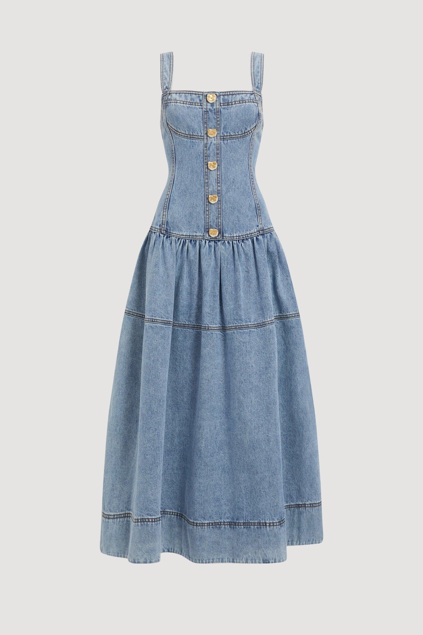 PRODUCT DETAILS Denim midi dress Firm fit denim Custom feature buttons Front faux button placket Square neckline External back zip with sculptural puller Gathered skirt Topstitching detail 100% Cotton Shop All Dresses SIZE AND FIT Model wears a size AU 8/S