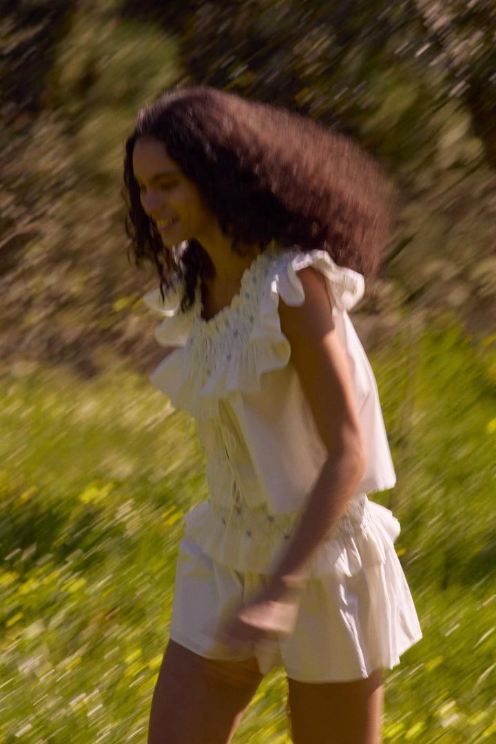 Made for barefoot walks, the Birdie Bow Smocked open-front blouse exudes effortless beauty. Adorned with dainty blue bow embroidered smocking at neckline and sleeves, this short sleeve white ruffled blouse features a wide neckline with ruffled edges.