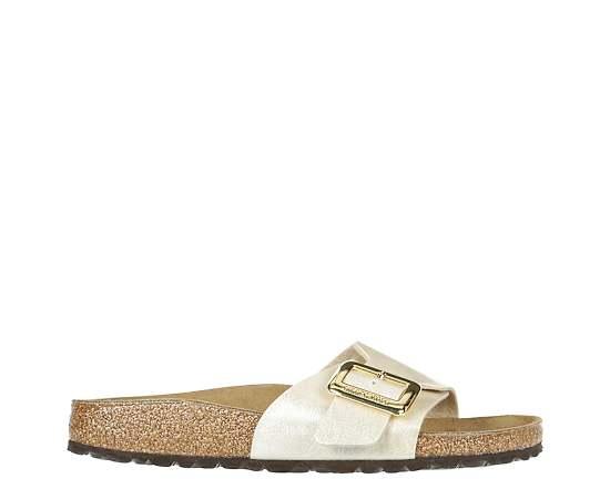 BIRKENSTOCK Catalina Luxe Buckle Graceful Womens Footbed Sandal - Off White Get ready to chase down those rays in the Catalina Luxe Buckle womens footbed Sandal from BIRKENSTOCK. Featuring a shimmery, embossed upper for glorious texture, this Slide displays the oversized Luxe Buckle to eyecatching effect. The contoured footbed cradles your foot with soft suede and a flexible traction sole. Birkenstock uses natural & renewable materials with a focus on environmentally friendly operations. Slip-On w/ buckle strap Suede lining Cork-latex footbed EVA outsole