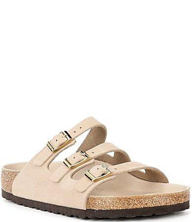 From Birkenstock, the Womens Florida Nubuck Triple Strap Slide Sandals feature:Nubuck leather upperTriple strap design with adjustable buckle closuresLeather liningClassic contoured cork footbed supports the arches of the footDeep heel cup for all day comfortEVA outsoleFlat heelImported.An exclusive early launch with Dillards and BIRKENSTOCK.