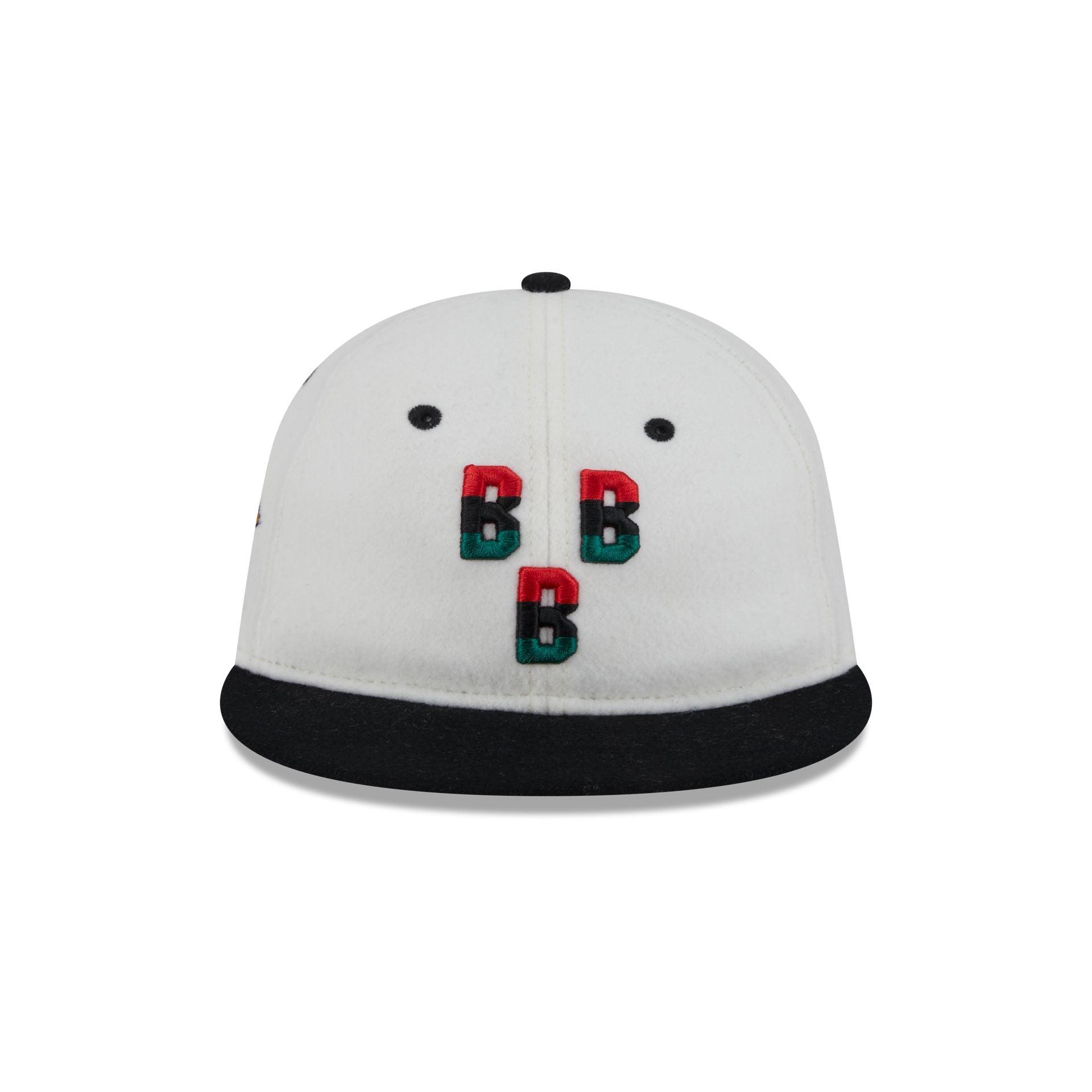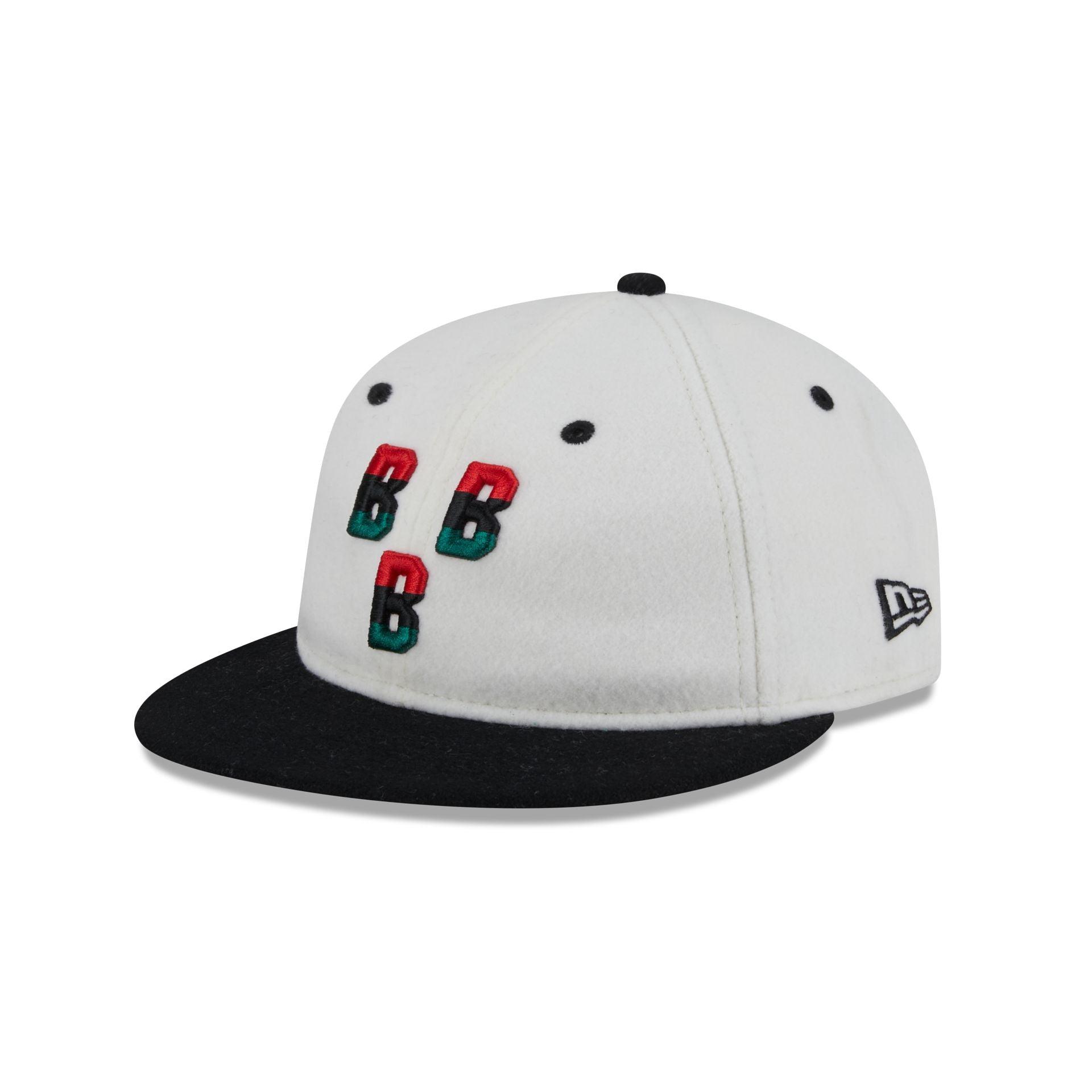 The Birmingham Black Barons Tri Color Retro Crown 9FIFTY Snapback features an embroidered Black Barons tricolor logo at the front panels with a Negro Leagues Baseball Museum patch at the right-wear side. Additional details include an adjustable leather closure at the rear and a green undervisor.