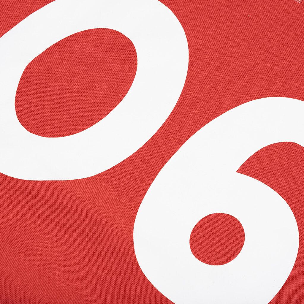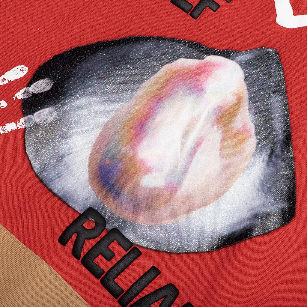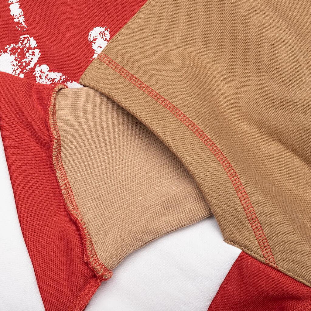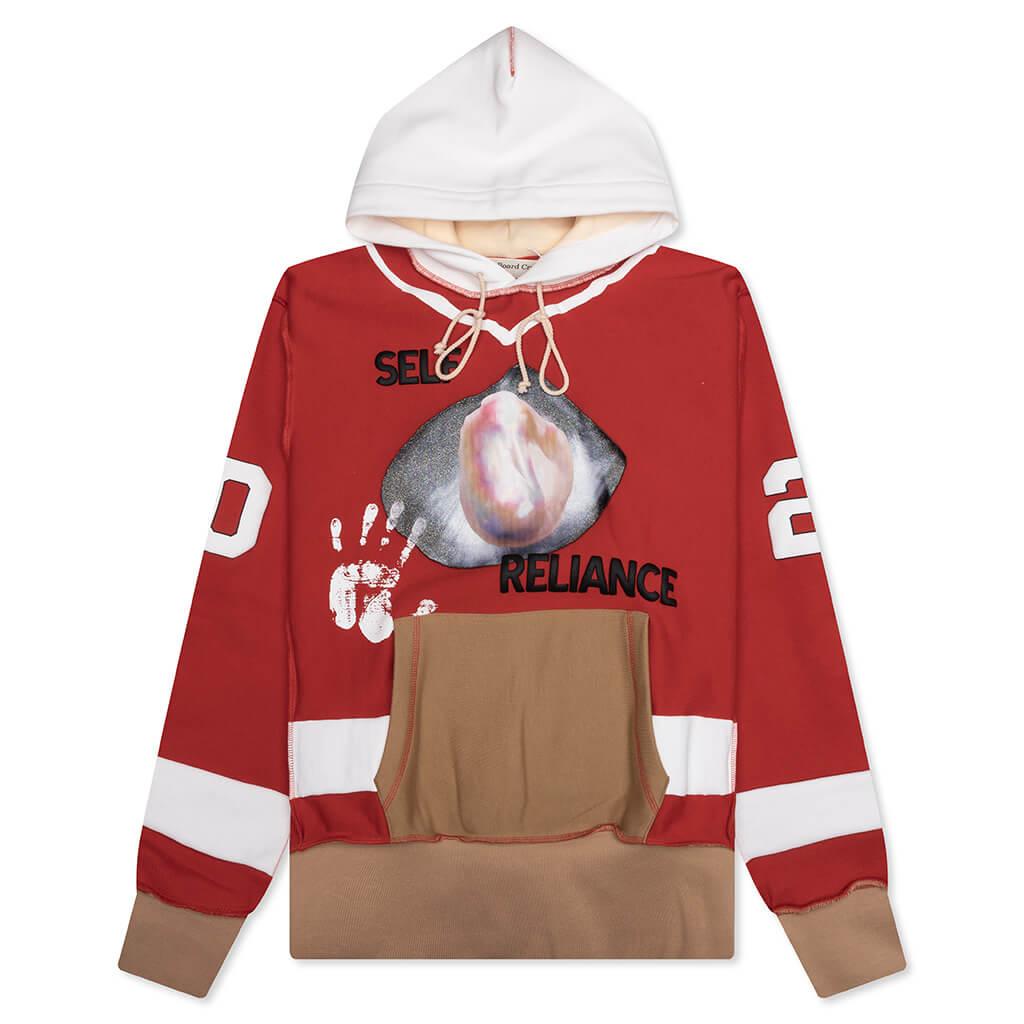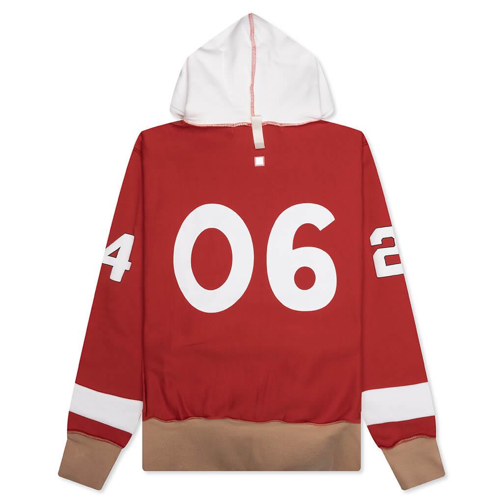 The Abc. Birthstone Hooded Sweatshirt: 06 in Red/Brown brings a refined approach to elevated streetwear. Crafted from custom heavyweight fleece, it features a custom-dyed body, panels, and ribbing.. An appliqué back number, authenticity hologram on the front, and embroidered details add layers of texture, while the multi-dimensional graphic incorporates print, transfer, transparency, overlays, puff, patchwork, embroidery, and fringe. Touches like a pull tab at the back neck and a woven flag label round out the design. Signature custom heavyweight fleece Custom dyed body, panels and rib Applique back number Authenticity hologram on front Embroidered details Layered graphic - (print, transfer, transparency, fabric overlay, puff, patch, embroidery, fringe,) Pulltab on back neck Woven flag label Style No: ABC-FW24-H021-EY06-RBRN