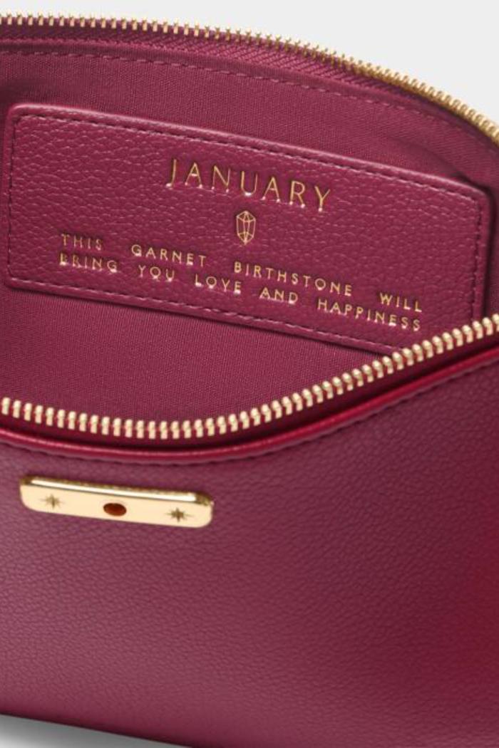 Our 'January' Birthstone Pouch features custom gold-tone hardware beautifully set with the month's real semi-precious stone Garnet. Inside the zip closure you'll discover a hidden message and individual traits that perfectly represent the birthday girl. For the ideal gift pair this pouch with the matching Birthstone Bracelet and Keychain.