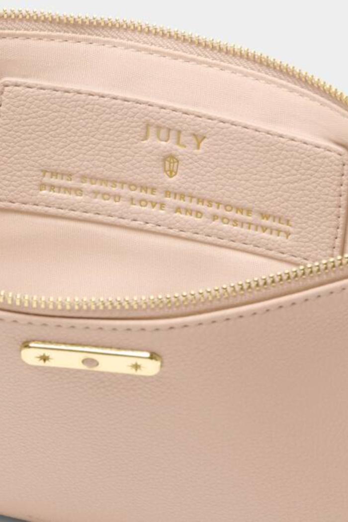Our 'July' Birthstone Pouch features custom gold-tone hardware beautifully set with the month's real semi-precious stone Sunstone. Inside the zip closure you'll discover a hidden message and individual traits that perfectly represent the birthday girl. For the ideal gift pair this pouch with the matching Birthstone Bracelet and Keychain.