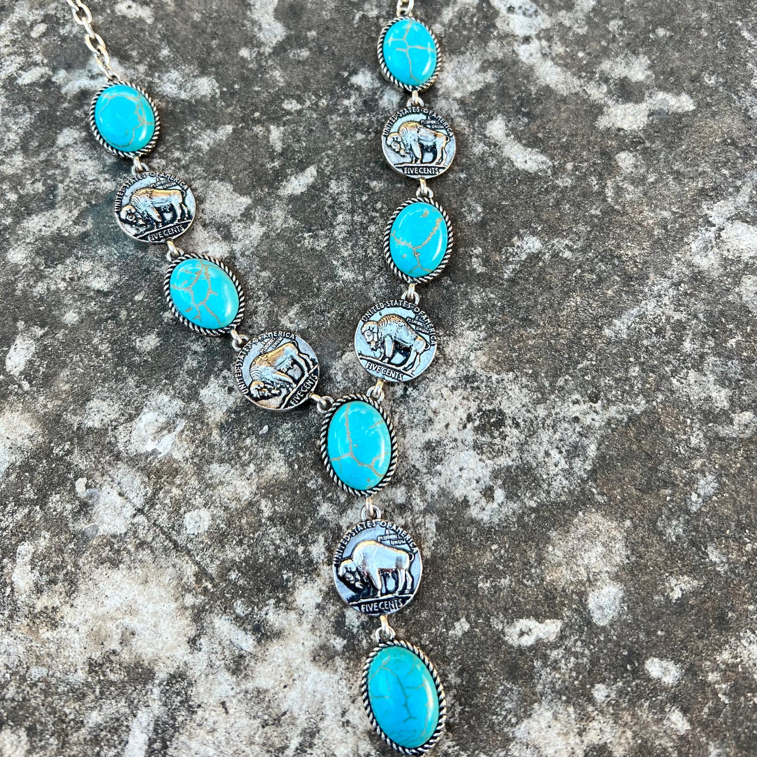 This Bison Roams Necklace is a western style turquoise stone and small buffalo nickel design inspired necklace is gorgeous. The round turquoise stone shapes paired with the silver buffalo nickel designs makes this necklace very unique. The necklace is the perfect addition to any western or southwestern outfit. 22" chain with a 3" drop dangle.