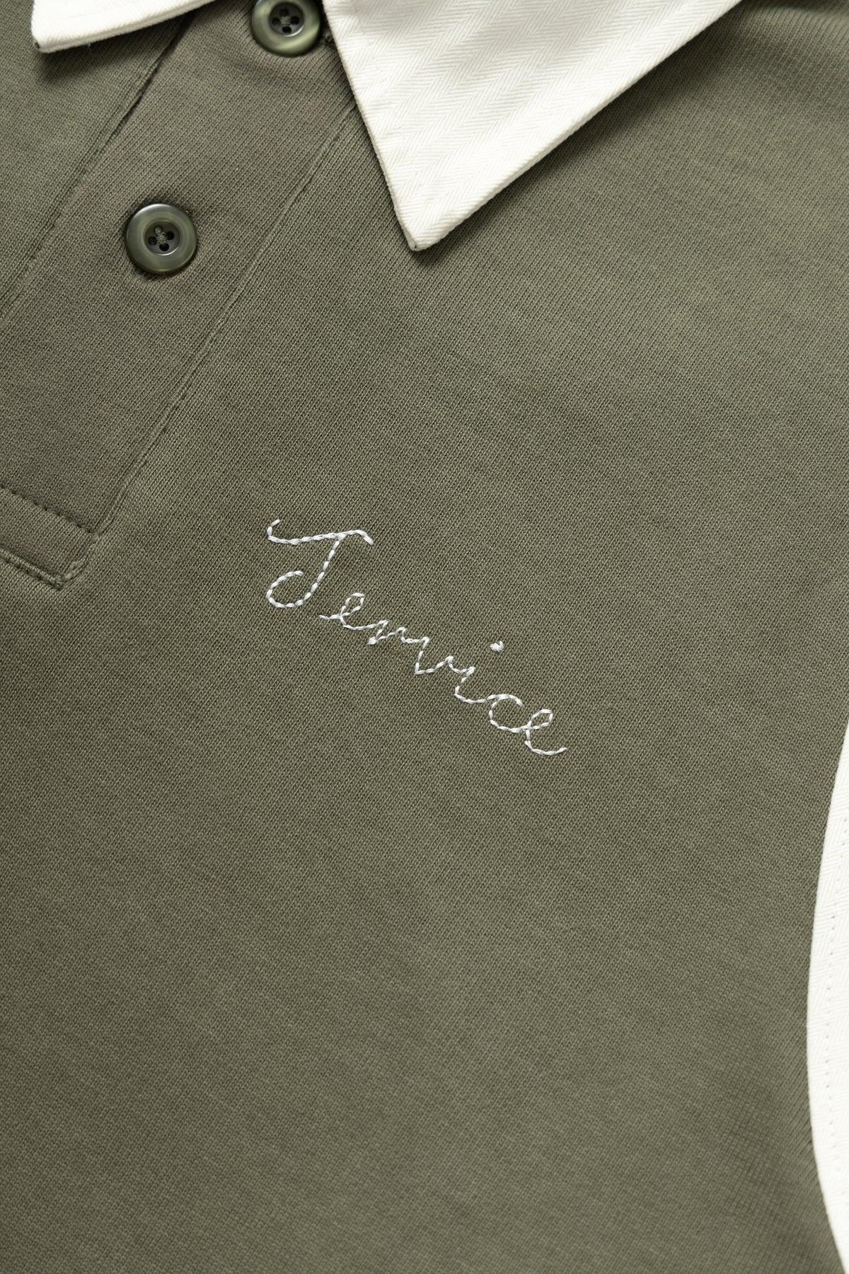 Bistro Polo by Service Works Constructed with 425GSM GOTS Organic heavyweight cotton Herringbone shoulder and collar details Elasticated cuff and waistband Embroidered Service detail