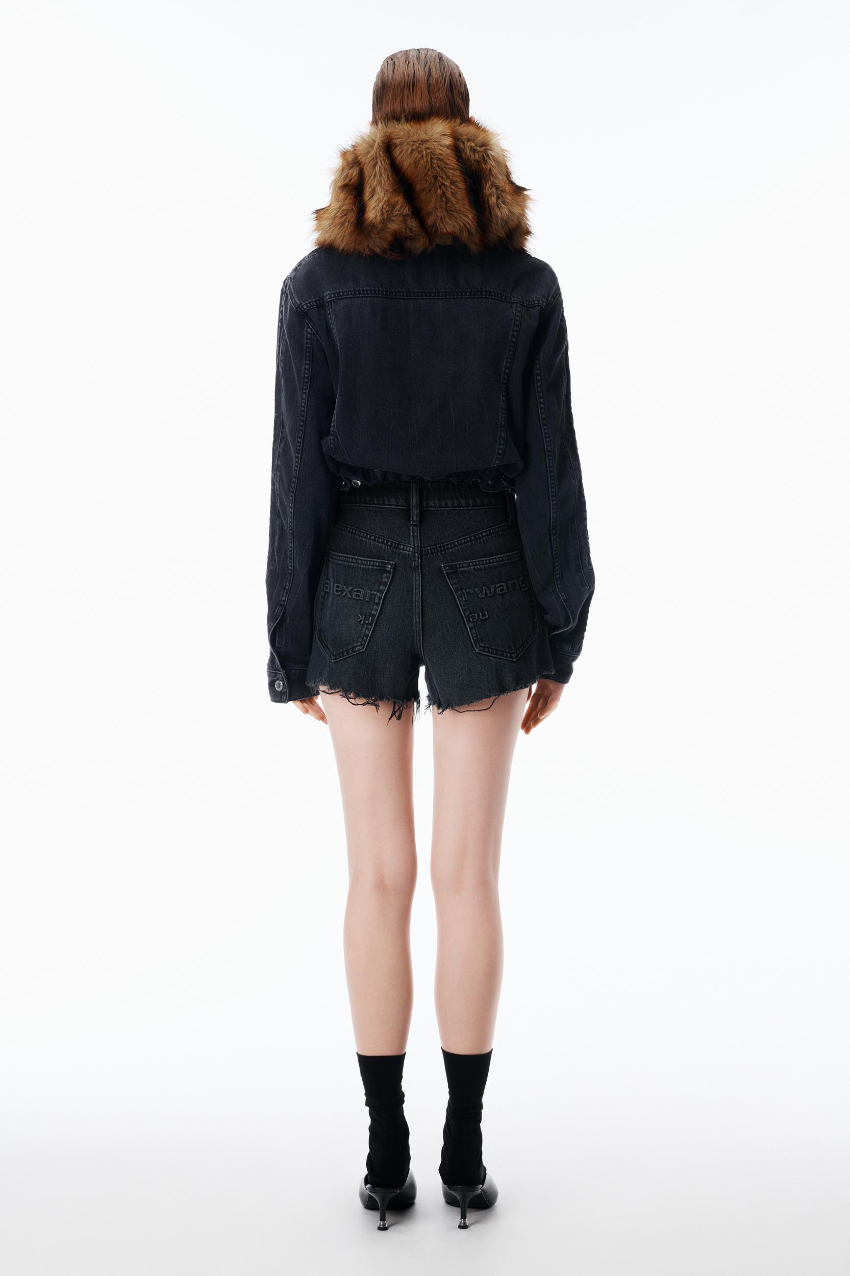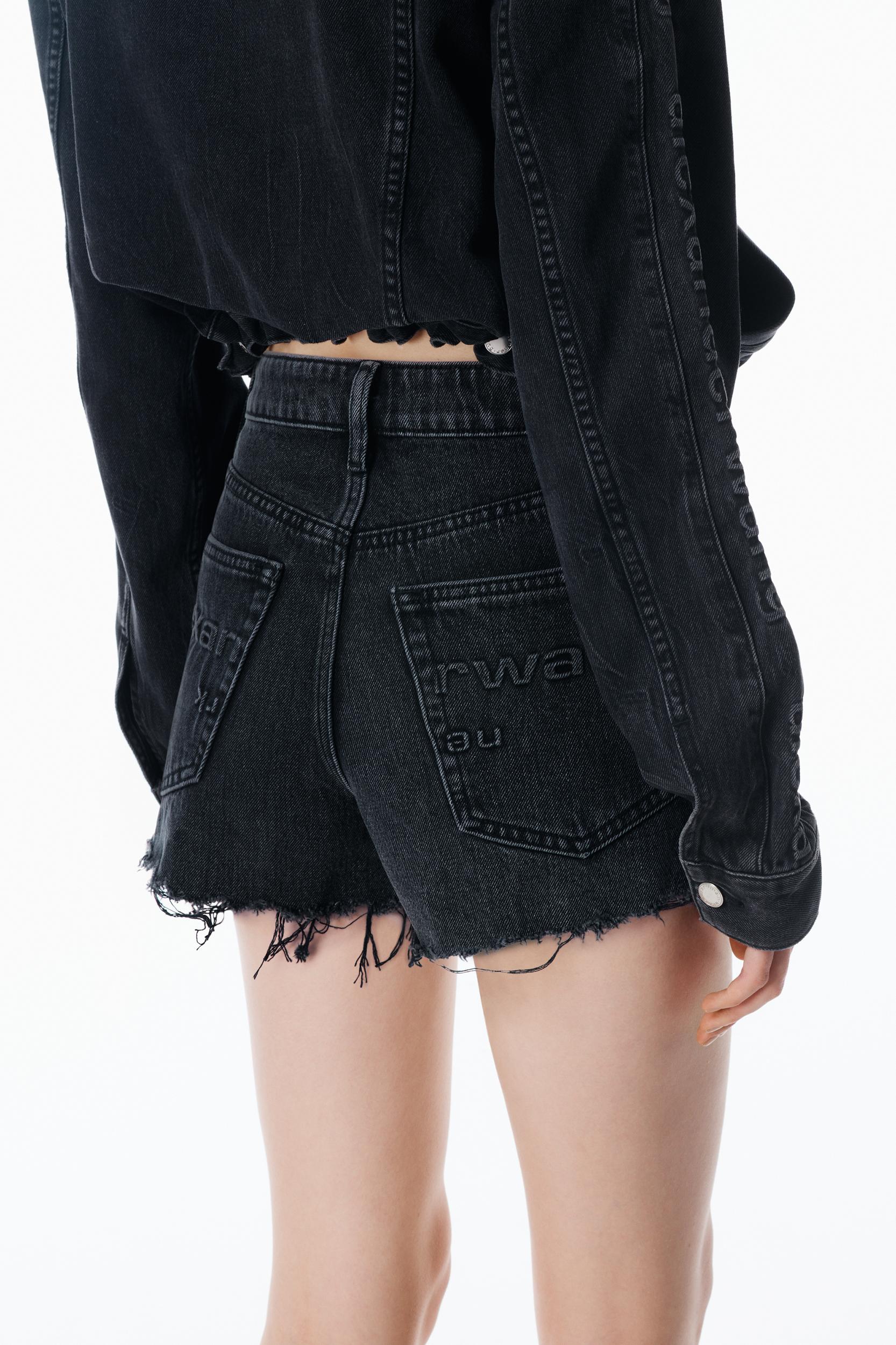 Cut to a high-rise, this light indigo denim cut-off bite short spotlights an unevenly hand-frayed hem for a natural, worn-in look. The signature 3D embossed logo at the back pockets amplifies this 5-pocket style in a grey aged wash.