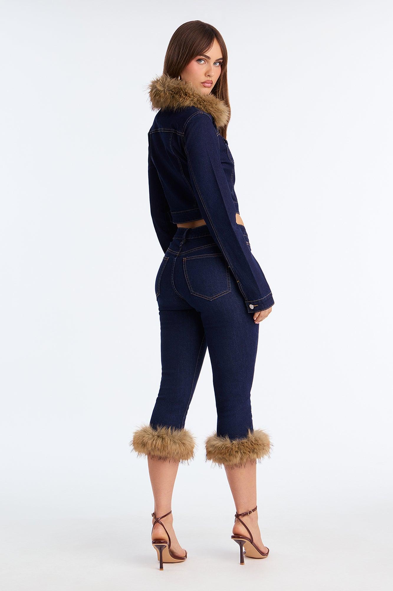 Available In Dark Denim. Pair With Bitter Queen Faux Fur Denim Jacket Capri Jeans 5 Pocket Faux Fur Trim 11" Rise 21" Inseam Medium Stretch Disclaimer: Due To The Specialized Wash Process, Each Garment Is Unique. Disclaimer: Fur Fall Out May Happen. Self : 93% Cotton 5% Viscose 2% Spandex Shell 2 : 100% Polyester Imported