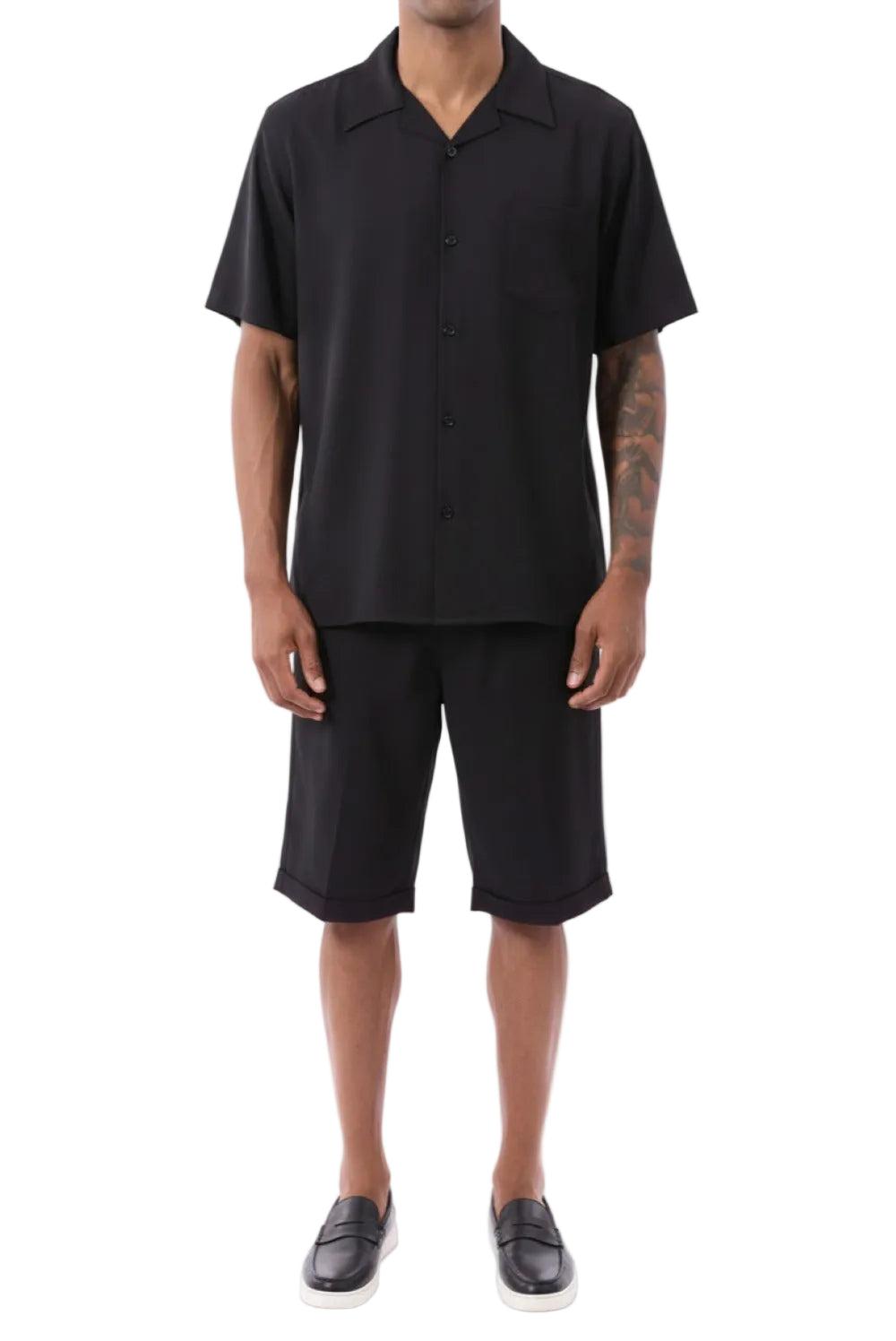 Black 2 Piece Short Sleeve Walking Suit Set with Elastic Waistband Shorts