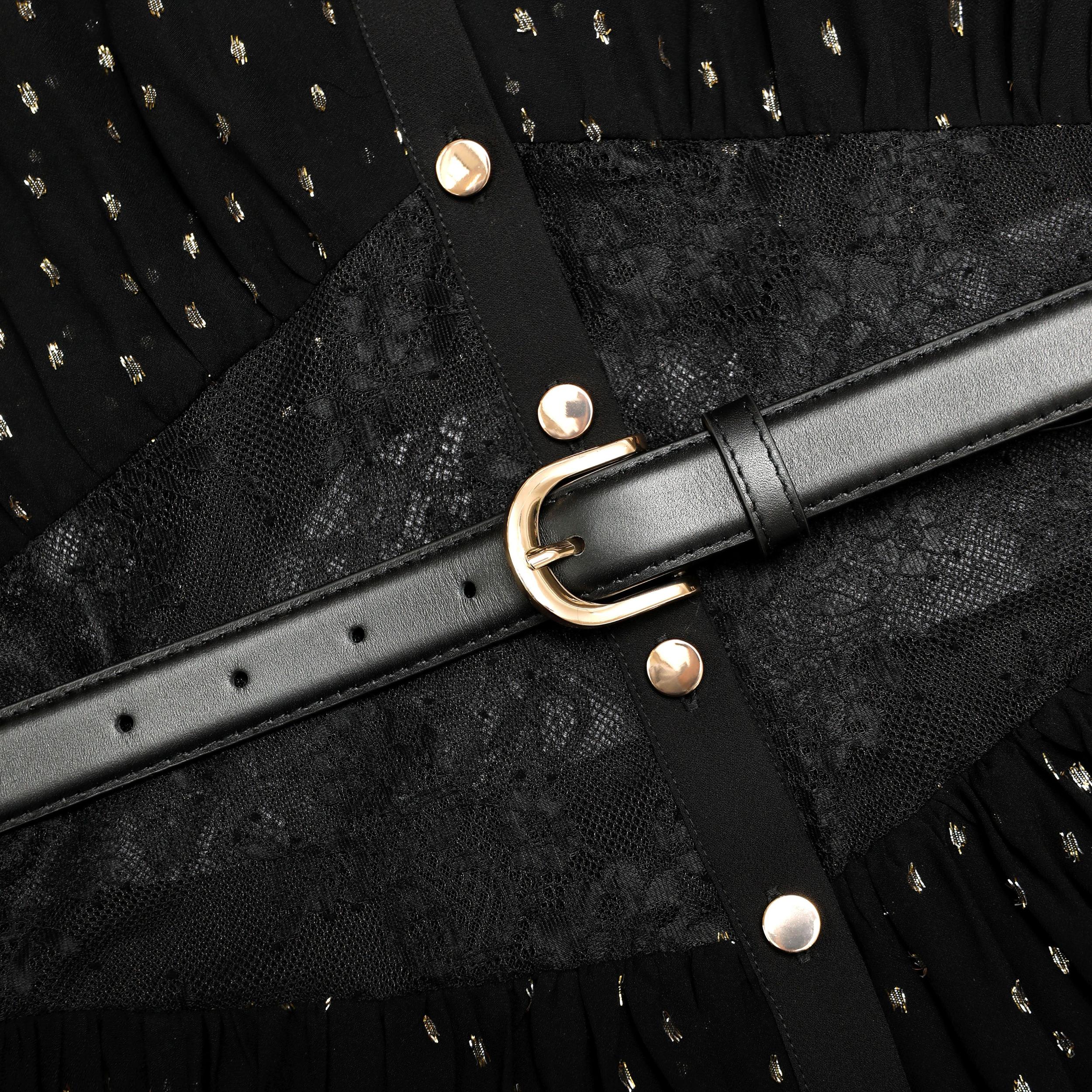 See and be seen in this mini dress, cut from shimmering fil coupé with peekaboo lace panels. Belted at the waist, a pussy bow neckline nods to vintage glamour — add heels for invite-only occasions. Fitted styleThis style has minimal stretchButton closure down frontPartial liningRemovable shoulder padsModel is 5ft10/178cm and wears a size UK 6