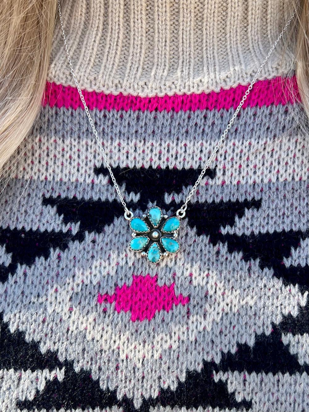 Experience the beauty and craftsmanship of the Turquoise Princess Flower Navajo Sterling Silver Necklace. Handcrafted by Native Americans, the luxurious neck...