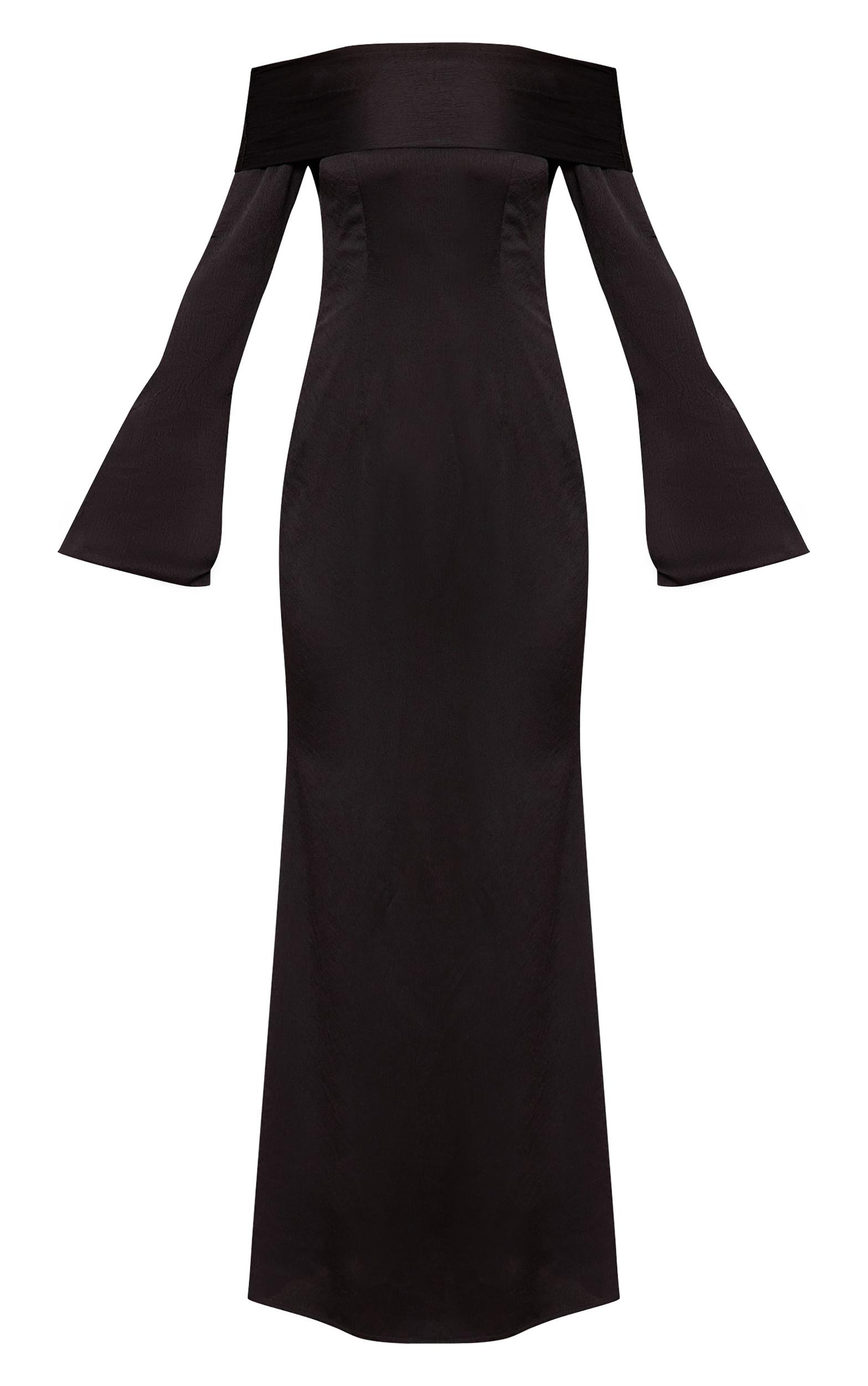 Embrace timeless allure with the black bardot long sleeve maxi dress. Soft stretch jersey shapes a close, column fit, while the off-shoulder bardot neckline frames the décolletage. Style with crystal drop earrings and a statement clutch for a classic evening look.Length approx 145cm/57inch (Based on sample size US 4)Model wears size UK 8/ EU 36/ AUS 8/ US 4Model Height - 5ft 9inchp]:!mb-4inch>Brand: PrettyLittleThingCategory: DressesProduct type: Bodycon DressColor: BlackMaterial: SatinSleeves: LongOccasion: Evening