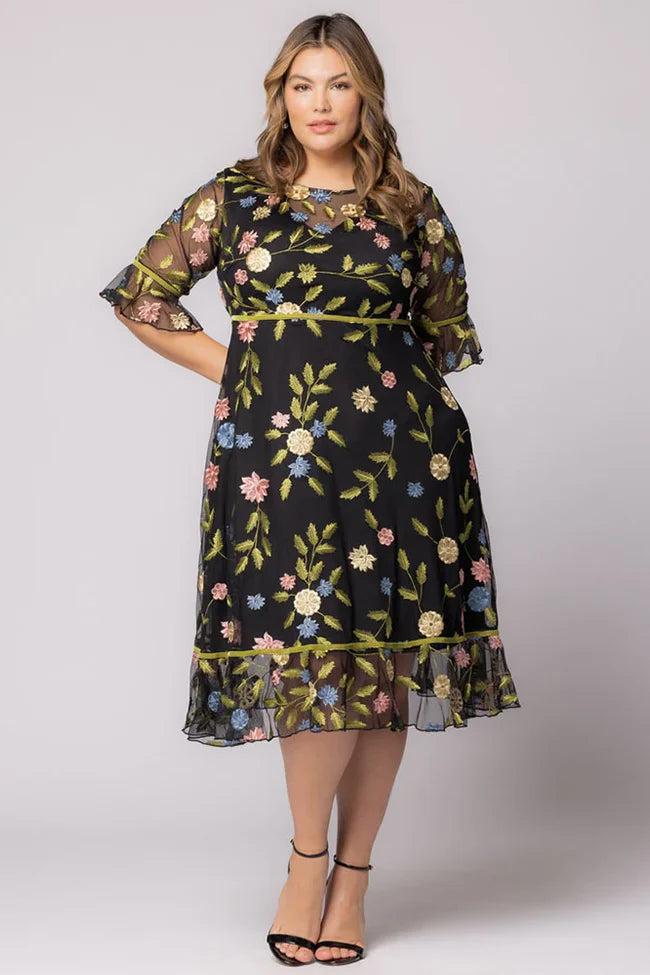 The Wildflower Embroidered Floral Mesh Dress is adorned with velvet trim touches, playful flounces, an A-line silhouette, and lined bodice and skirt. A perfect midi cocktail dress for any special occasion or semi-formal or formal party and a wedding guest favorite. Available in women's plus sizes.