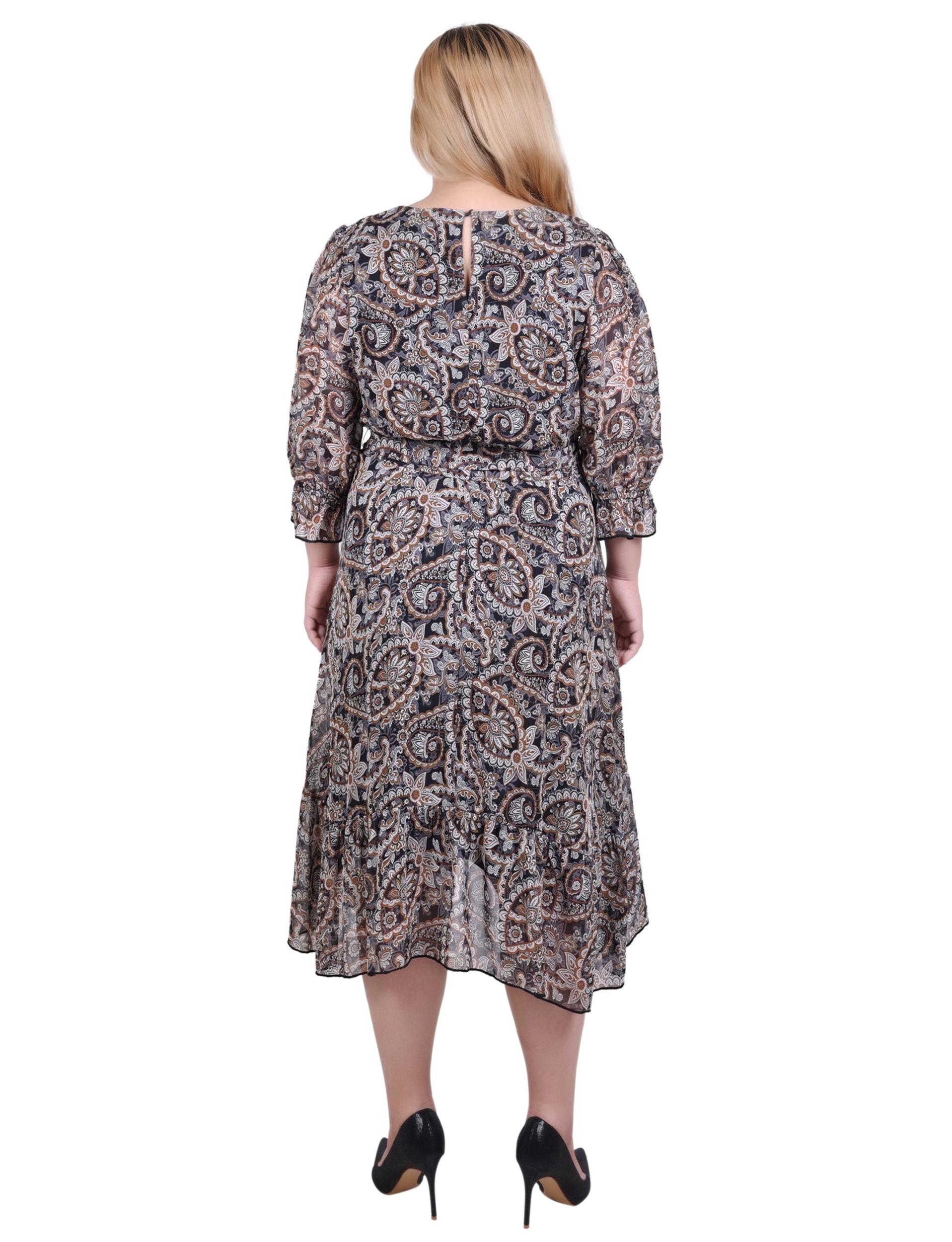Black Brown Paisley 3/4 Sleeve V-Neck Flounced Dress - Plus
