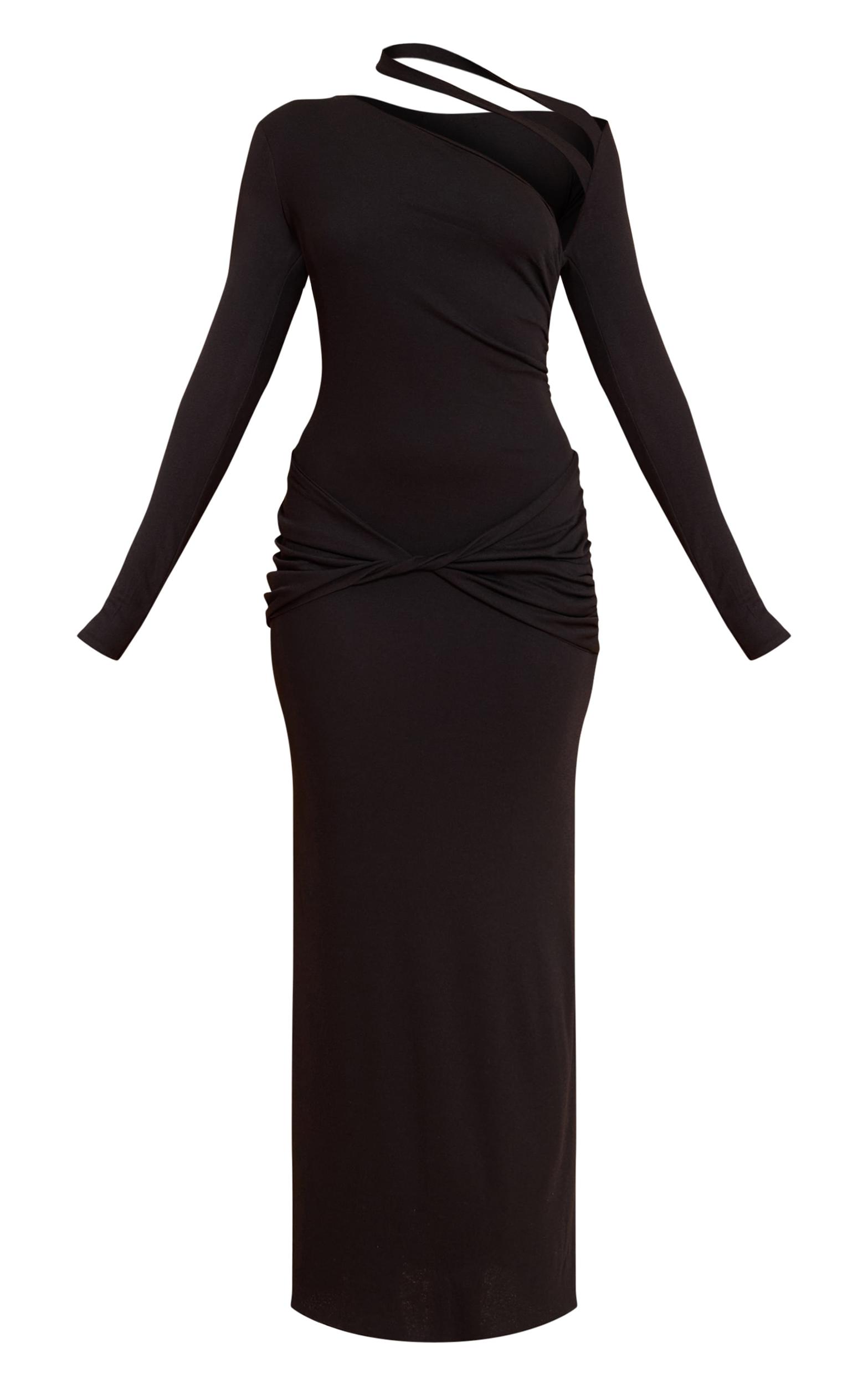 Make a statement in the black burnout mesh ruched asymmetric maxi dress. Crafted from a sheer burnout mesh material with ruched detailing and asymmetric hemline, this maxi dress exudes dramatic evening flair. Style with strappy heels and bold earrings for a standout occasion look.Length approx 155cm/61inch (Based on sample size US 4)Model wears size UK 8/ EU 36/ AUS 8/ US 4Model Height - 5ft 9inchp]:!mb-4inch>Brand: PrettyLittleThingCategory: DressesProduct type: Bodycon DressColor: BlackMaterial: MeshDesign: PlainNeckline: AsymmetricSleeves: LongOccasion: Evening