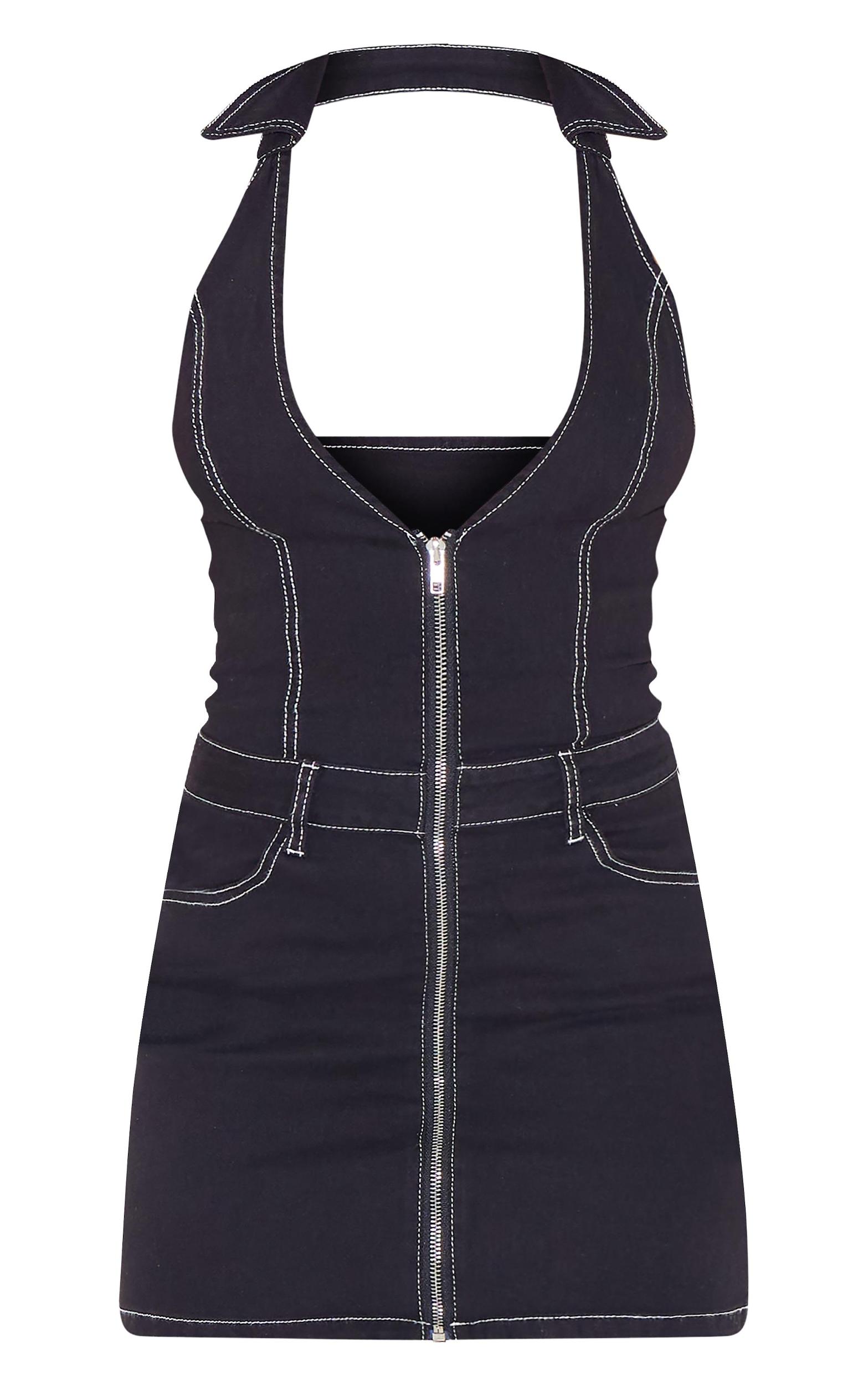 Stay on trend this season in this black contrast stitch halterneck denim mini dress. Brought to you in a black denim material with a halterneck design and contrasting stitch detailing, how can you resist? Style this mini dress with heels and a bold hue jacket for a look that is sure to make heads turn wherever you go. Length approx 81cm/32inch (Based on a sample size UK 8) Model wears size UK 8/ EU 36/ AUS 8/ US 4Model Height - 5ft 7inchp]:!mb-0inch>Category: DenimProduct type: Denim Evening DressColor: BlackMaterial: Rigid DenimOccasion: Evening