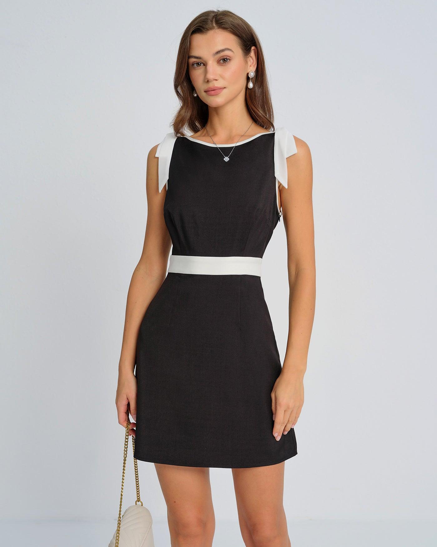 - Occasion: special occasion - Style: Formal - Season: Spring, Summer - Back Neckline: Square - Fabric Stretch: No Stretch - Waist: Natural Waisted - Sleeve Length: Sleeveless - Sleeve Type: Sleeveless - Pattern Type: Solid - Embellishment: Bowknot, Contrasting colors - Neckline: Boat Neck - Dress Type: Sheath dress - Silhouette: A-Line - Fabric: Polyester 97.0%, Spandex 3.0% - Material: Worsted woven