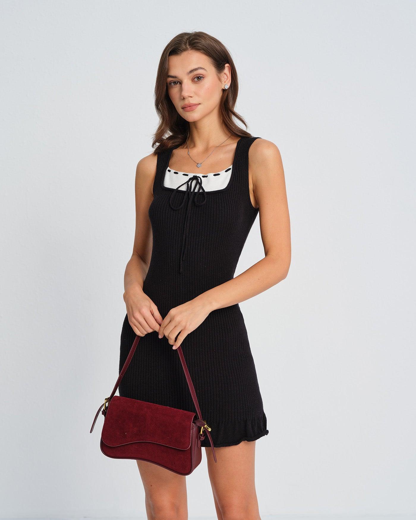 - Occasion: Daily - Style: Elegant - Fabric Stretch: Medium Stretch - Waist: Natural Waisted - Sleeve Length: Sleeveless - Pattern Type: Solid - Embellishment: Contrasting colors, Tie - Neckline: Square Neck - Silhouette: Bodycon - Fabric: Viscose 49.3%, Polyamide 27.7%, Polyester 23.0%