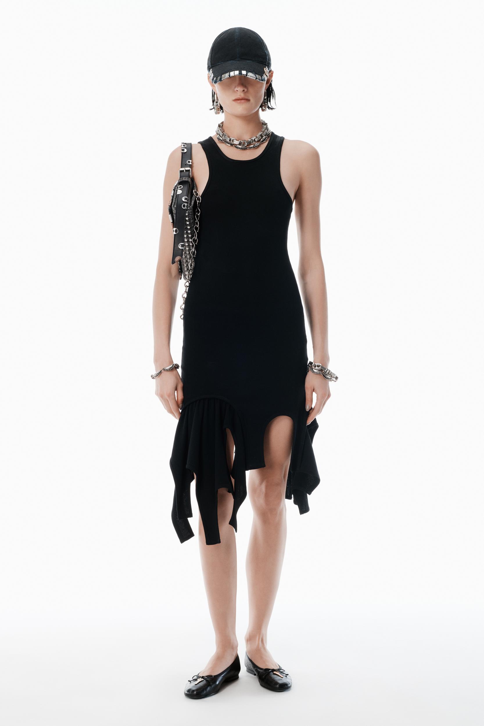 Asymmetrical godets and a handkerchief hem accentuate the deconstructed look of this black drop-waist mini tank dress.