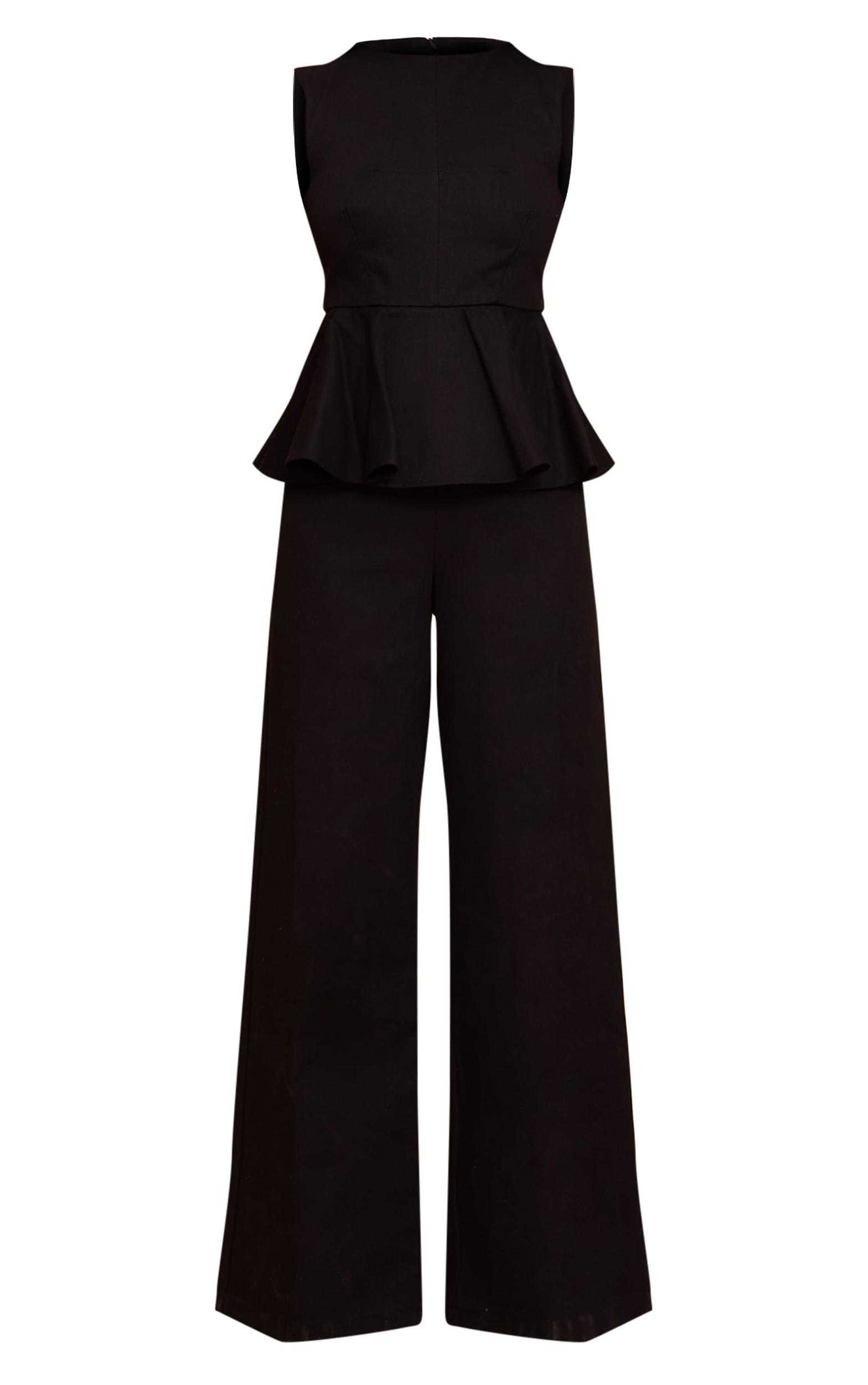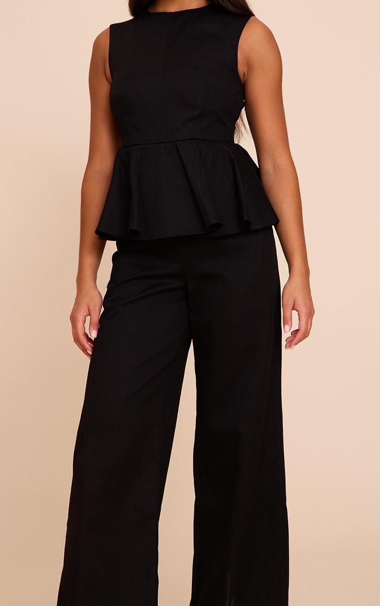 The black cotton peplum detail wide leg jumpsuit fuses comfort with chic design. Made from breathable cotton, this jumpsuit features a figure-defining peplum waist and flowing wide-leg pants that balance structure with fluidity. The sleeveless cut allows for easy layering or standalone wear. Pair it with heels and a crossbody bag for a dressy night out, or throw on a cropped denim jacket and sandals for a laid-back twist.Length approx 155cm/61inch (Based on sample size US 4)Model wears size UK 8/ EU 36/ AUS 8/ US 4Model Height - 5ft 7inchp]:!mb-4inch>Brand: PrettyLittleThingCategory: DressesProduct type: Wide Leg JumpsuitColor: BlackMaterial: TwillNeckline: CrewSleeves: SleevelessOccasion: Evening