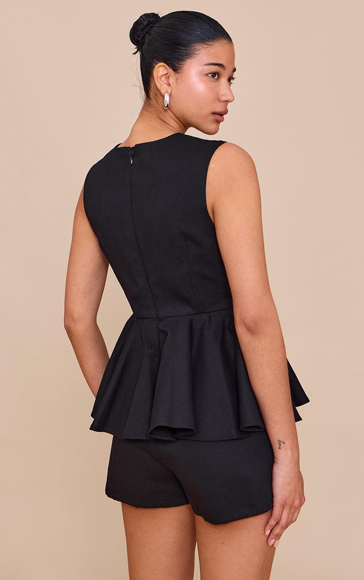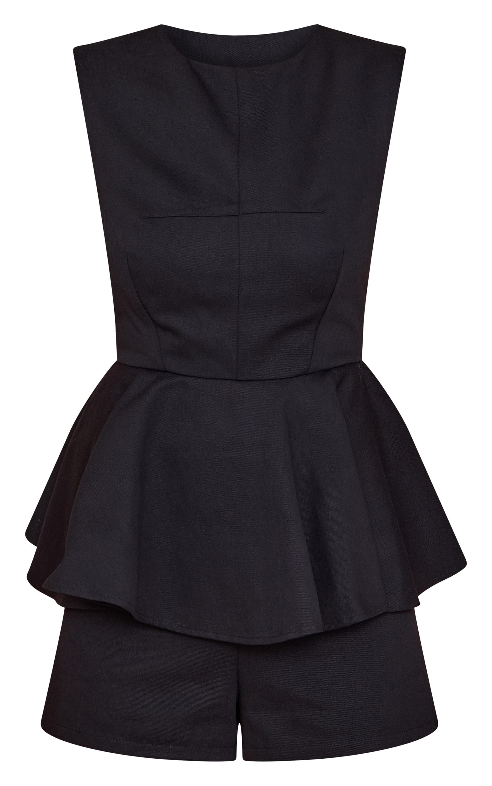 Build a foundational piece for your day rotation. The black cotton peplum skort romper offers a clean, structured shape crafted from pure cotton that ensures it keeps its form from morning to night. Featuring a cinched peplum waist detail above a clever skort design that gives you the freedom of shorts with the look of a mini skirt, this piece nails easy style. Simply add chunky sneakers and minimalist accessories to complete the confident off-duty look.Length approx 81.5cm/32inch (Based on sample size US 4)Model wears size UK 8/ EU 36/ AUS 8/ US 4Model Height - 5ft 9inchp]:!mb-4inch>Brand: PrettyLittleThingCategory: Jumpsuits & PlaysuitsProduct type: Tailored PlaysuitColor: BlackMaterial: TwillDesign: PlainNeckline: RacerSleeves: SleevelessOccasion: Day