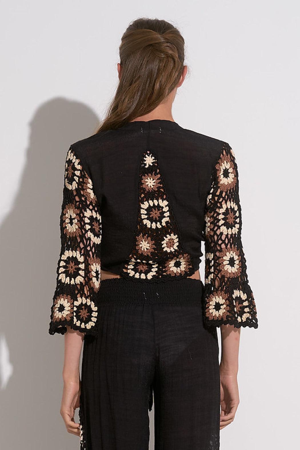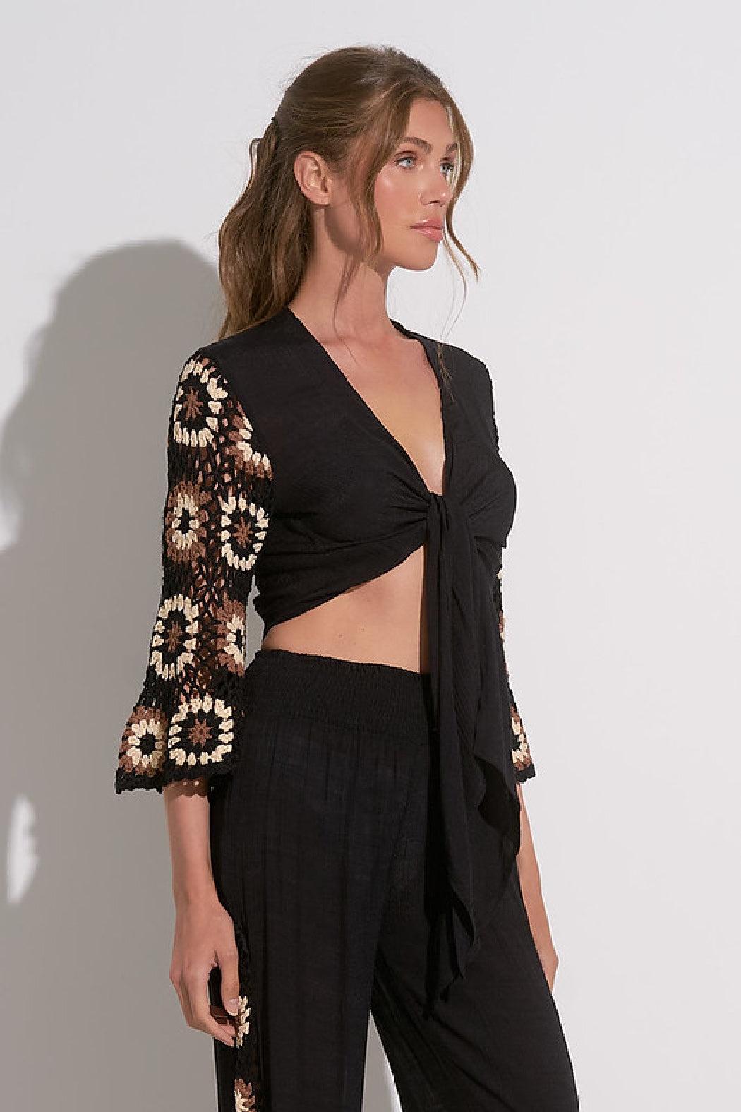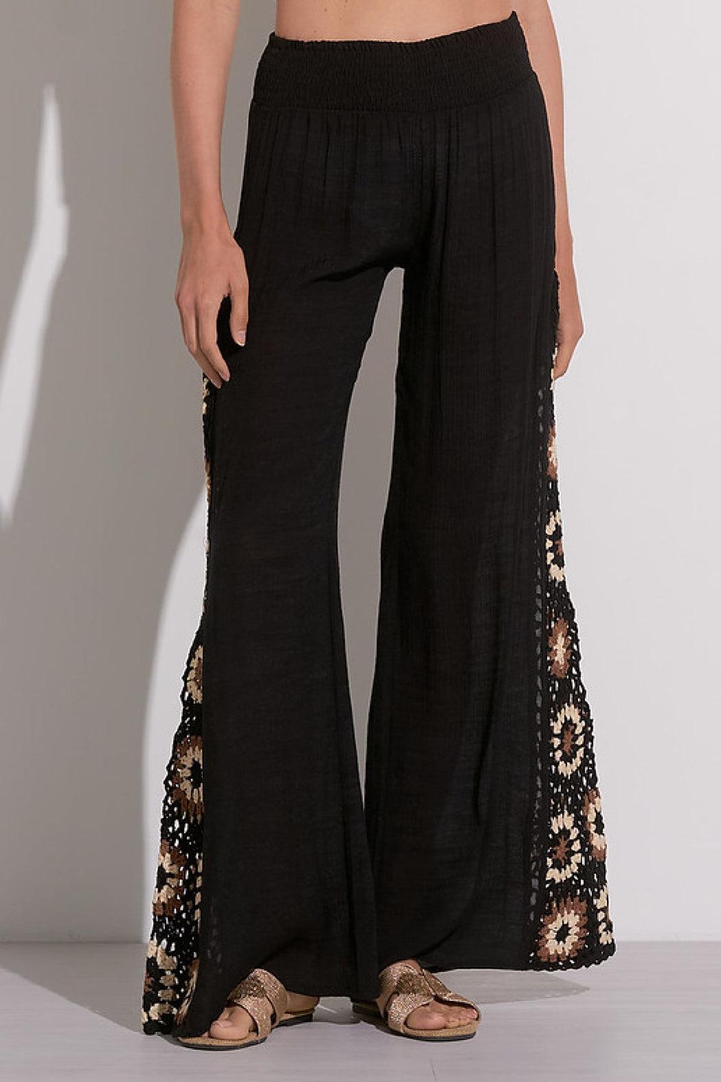 This one is for all the summer loving ladies out there! Modern and boho-inspired, the front tie top features beautifully crochet sleeves with flowers that add pop of color. The pants features an accent of flower panels for a bohemian feel. Airy and effortless for easy cover up over swimwear.