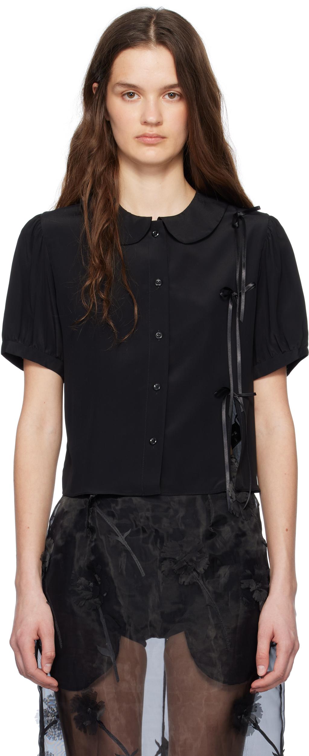 Black Cropped Bow Slit Puff Sleeve Shirt