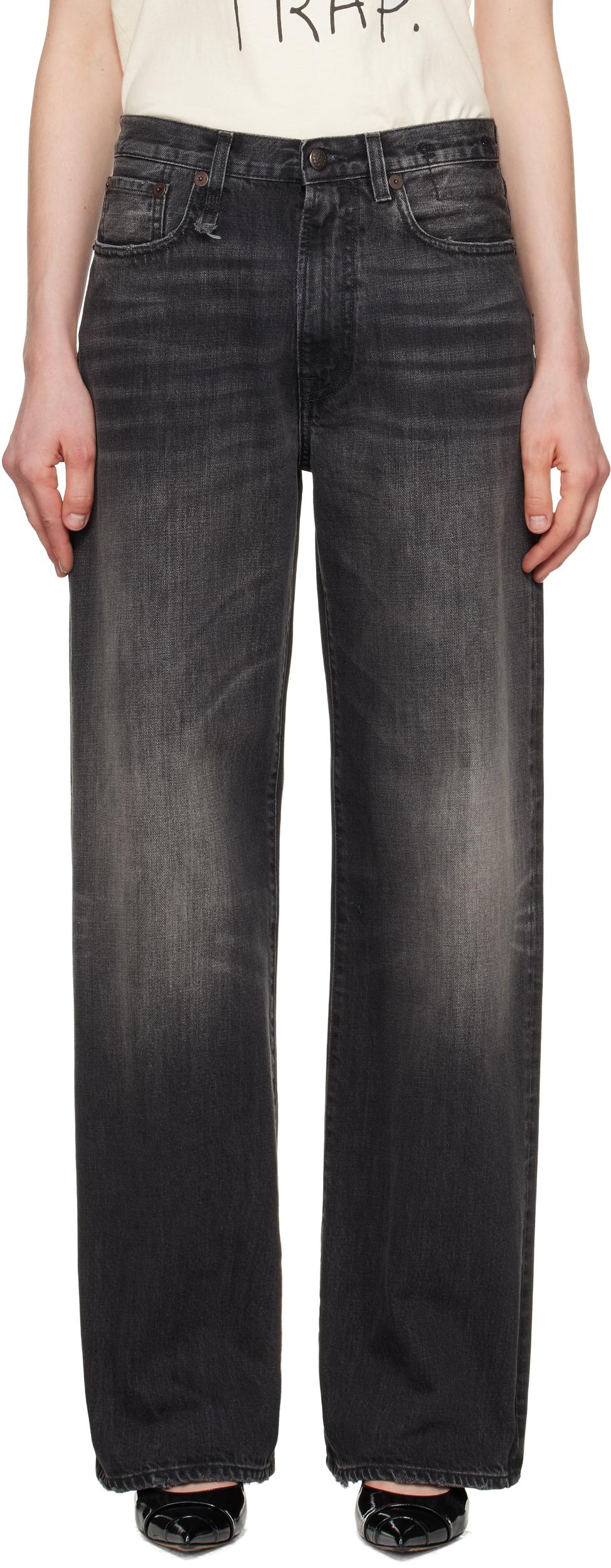 Wide-leg 12.5 oz non-stretch denim jeans. Fading, whiskering, and subtle distressing throughout.