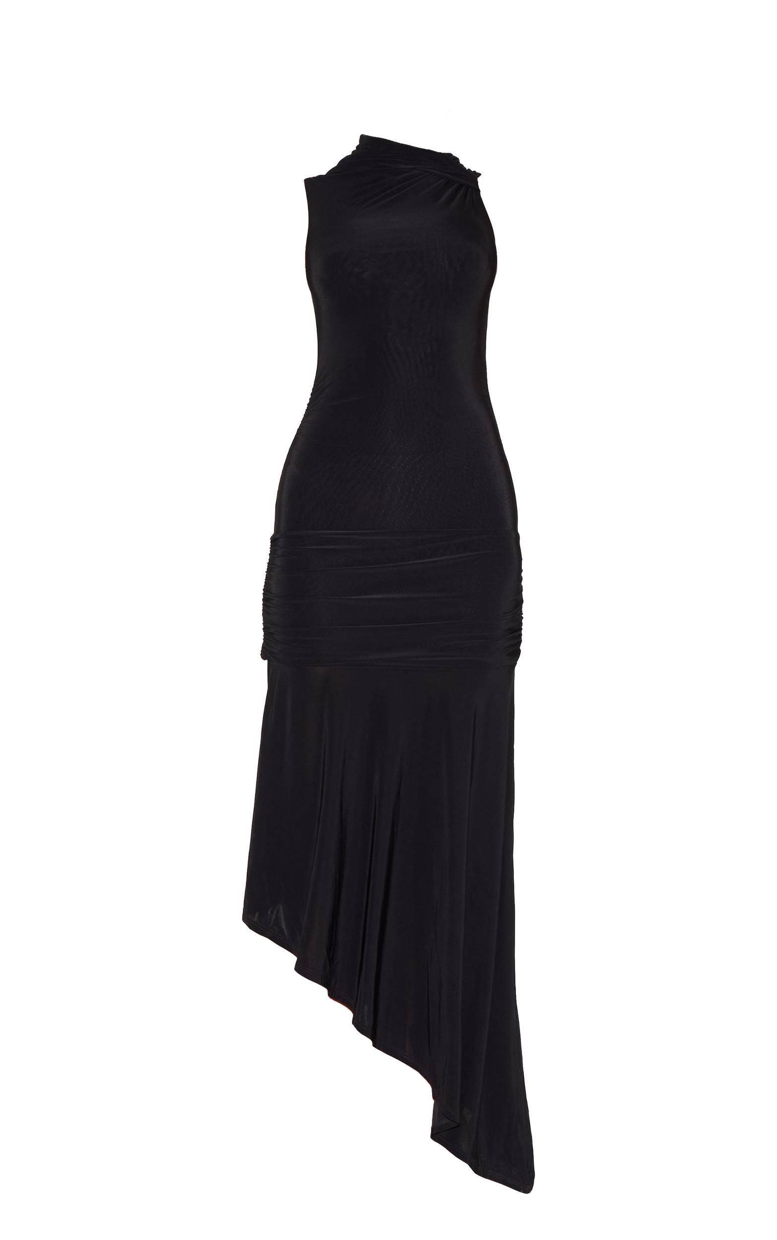 Tailored from a black double layer slinky material with an asymmetrical hem and shoulder, ruched waist detailing and a chic midaxi fit. The perfect addition to your occasion wear wardrobe, style this black double layer slinky asymmetrical ruched midaxi dress with a minimalistic pair of heels and refined gold hoop earrings.Length approx 134.5cm/53inch (Based on sample size US 4)Model wears size UK 8/ EU 36/ AUS 8/ US 4Model Height - 5ft 8inchp]:!mb-4inch>Brand: PrettyLittleThingCategory: DressesProduct type: Shift DressColor: BlackMaterial: Slinky JerseyDesign: PlainNeckline: High NeckSleeves: SleevelessOccasion: Evening