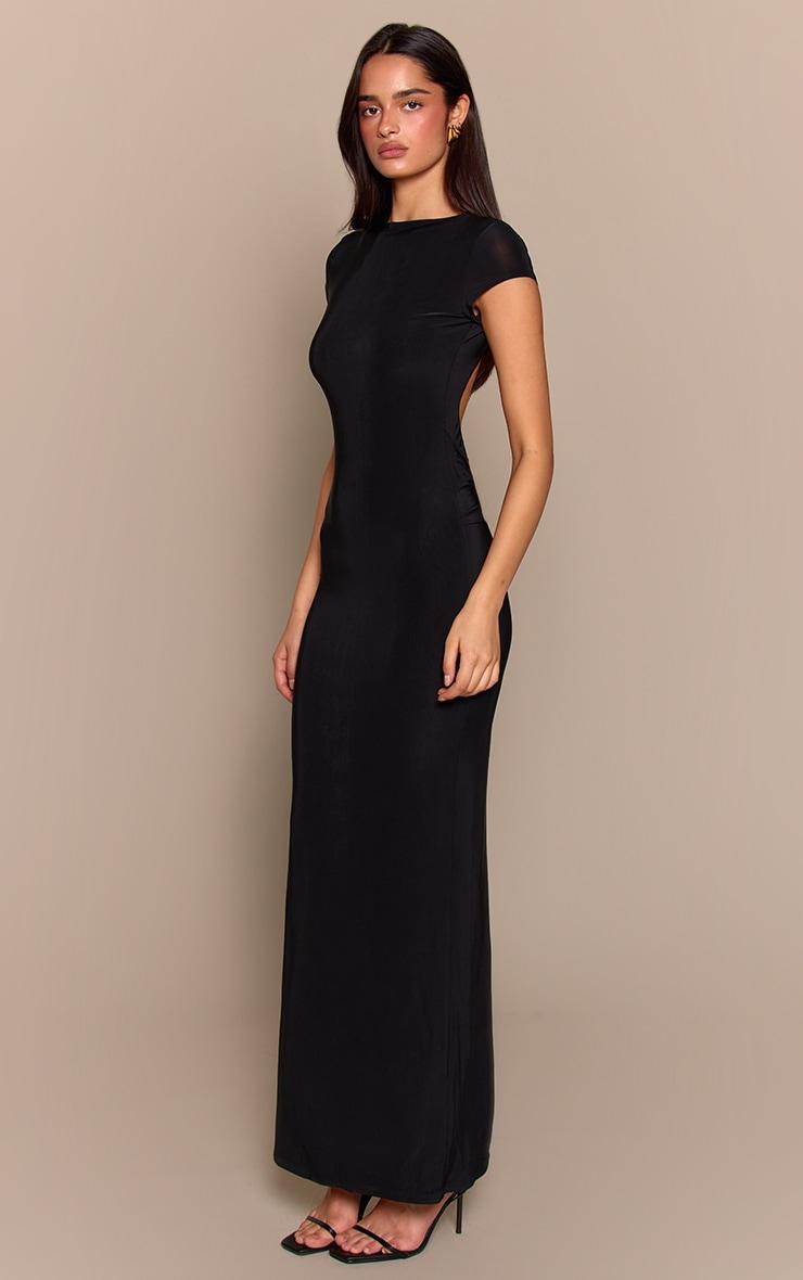 Make an entrance in this black double layer slinky open back drape maxi dress. Crafted from a chic black slinky double layer material with an open back and soft draped detailing, it features a fluid, figure-skimming fit. Style with barely-there heels and statement earrings for an elevated evening look. Length approx 155cm/61inch (Based on sample size US 4)Model wears size UK 8/ EU 36/ AUS 8/ US 4Model Height - 5ft 8inchp]:!mb-4inch>Brand: PrettyLittleThingCategory: DressesProduct type: Bodycon DressColor: BlackMaterial: Slinky JerseyNeckline: CrewSleeves: ShortOccasion: Evening