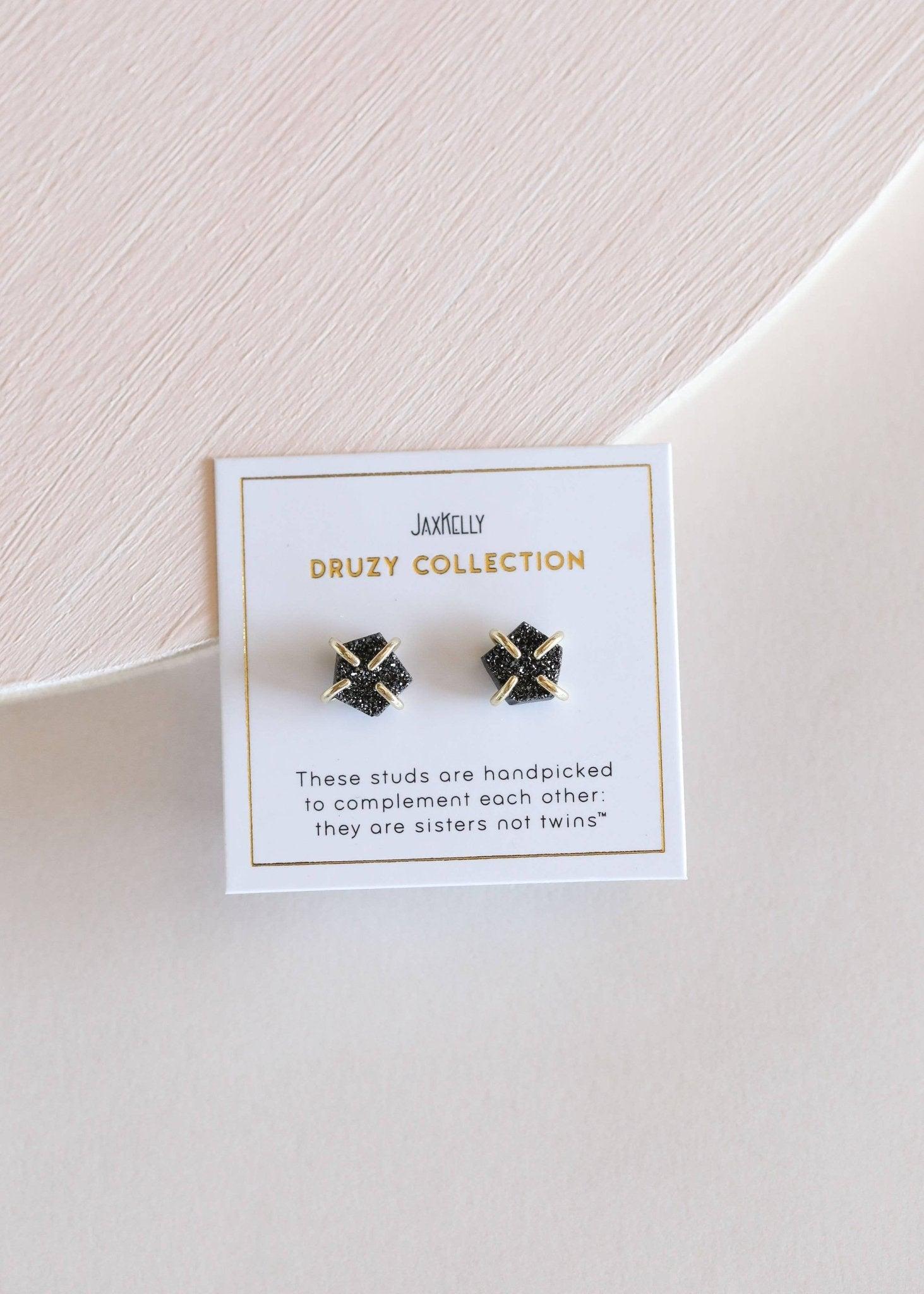 Tarnish Free - Long lasting protective coating safeguarding your jewelry from sweat, water, and more.Sterling Silver – 18K gold plating Hypoallergenic – Lead FreeBlack Druzy Stones Set in 4 prongs