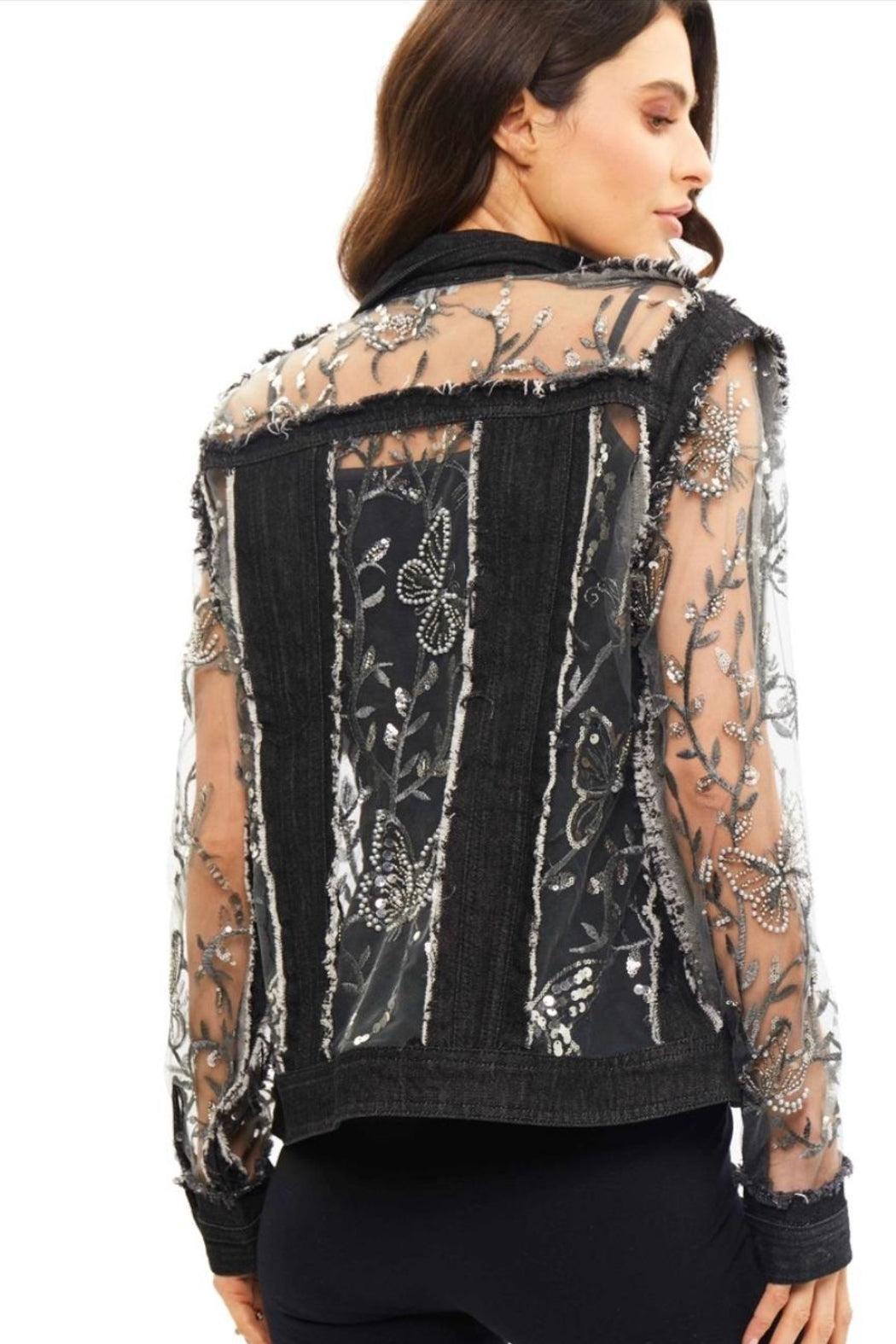 This stunning embellished denim jacket features a unique combination of classic black denim and sheer mesh fabric adorned with intricate floral embroidery, pearl butterflies and sparkling beadwork. Perfect for adding a touch of glamour to any outfit this jacket is a versatile piece that can be dressed up or down for any occasion. Model is wearing a size small.