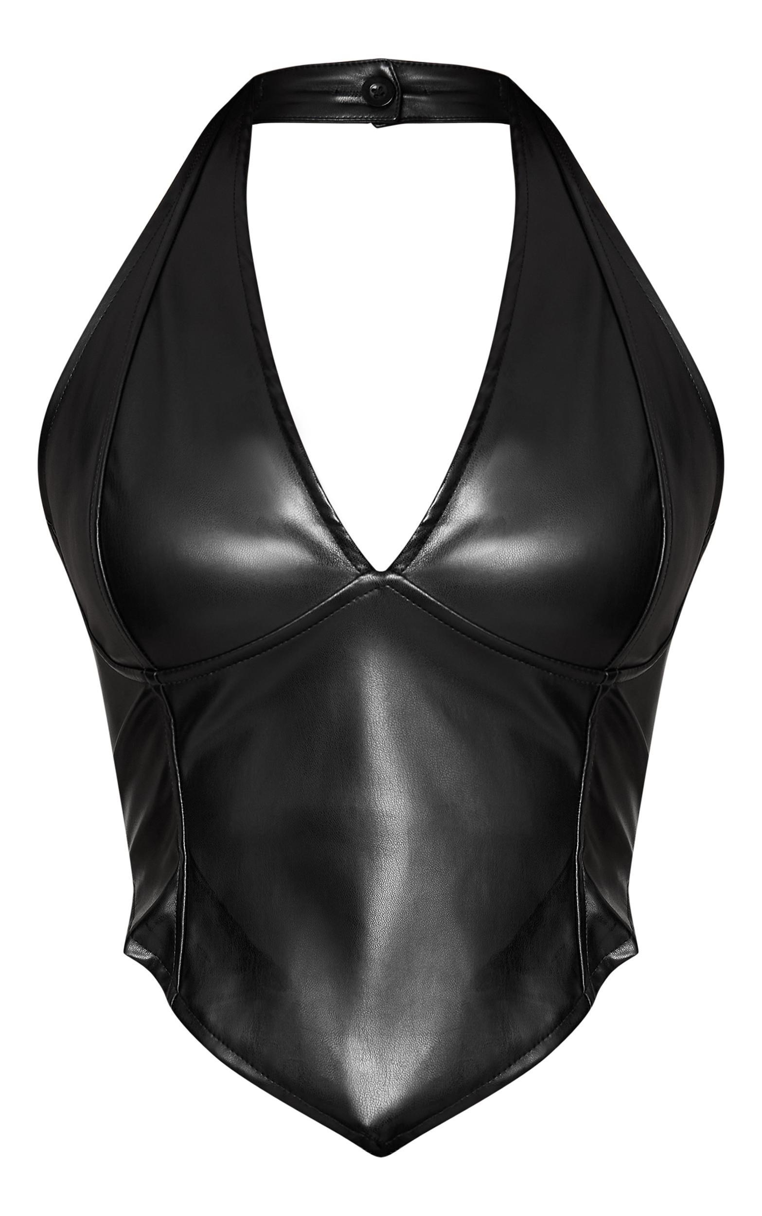 Update your basics with the black faux leather halterneck crop top. Designed in a black faux leather material, this top includes a halterneck design, cropped length and sleek finish for an edgy touch. Style with high-rise pants and heels for a statement night-out look.Length approx 38cm/15inch (Based on sample size US 4)Model wears size UK 8/ EU 36/ AUS 8/ US 4Model Height - 5ft 9inchp]:!mb-4inch>Brand: PrettyLittleThingCategory: TopsProduct type: CorsetColor: BlackMaterial: Faux LeatherOccasion: Evening