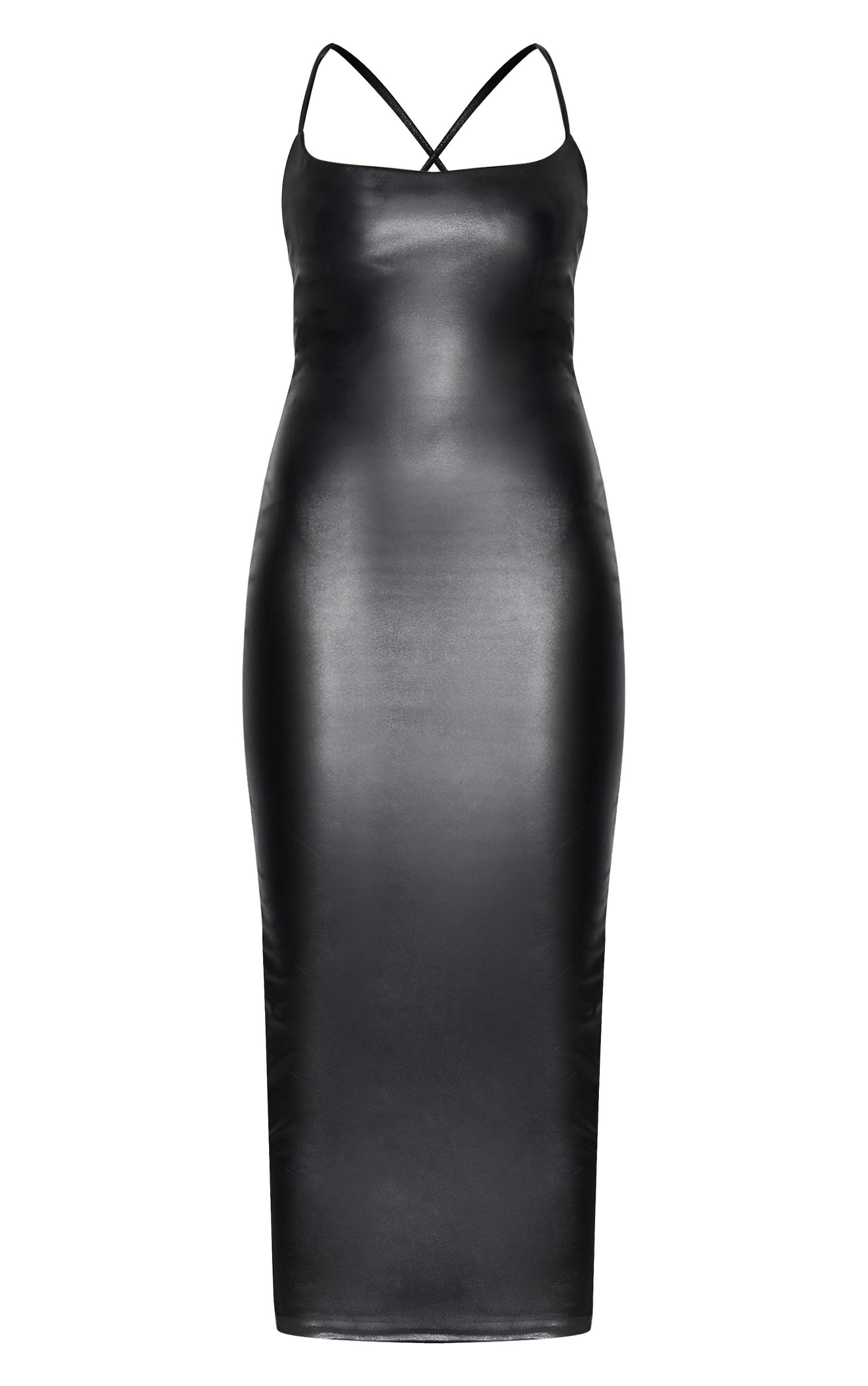 Consider this your sartorial secret weapon: a black faux leather midi dress sculpted to command attention. The sleek faux leather composition offers a modern edge, while the lace-up back introduces an element of considered detail. Designed to subtly enhance the silhouette, this midi length ensures versatile styling options. Accentuate the look with a sculptural cuff from our jewelry collection for a refined after-dark aesthetic. Length approx 125cm/49inch (Based on a sample size UK 8) Model wears size UK 8/ EU 36/ AUS 8/ US 4Model Height - 5ft 9inchp]:!mb-4inch>Brand: PrettyLittleThingCategory: DressesProduct type: Bodycon DressColor: BlackMaterial: Faux LeatherDesign: PlainNeckline: Straight NeckSleeves: Spaghetti StrapOccasion: Evening